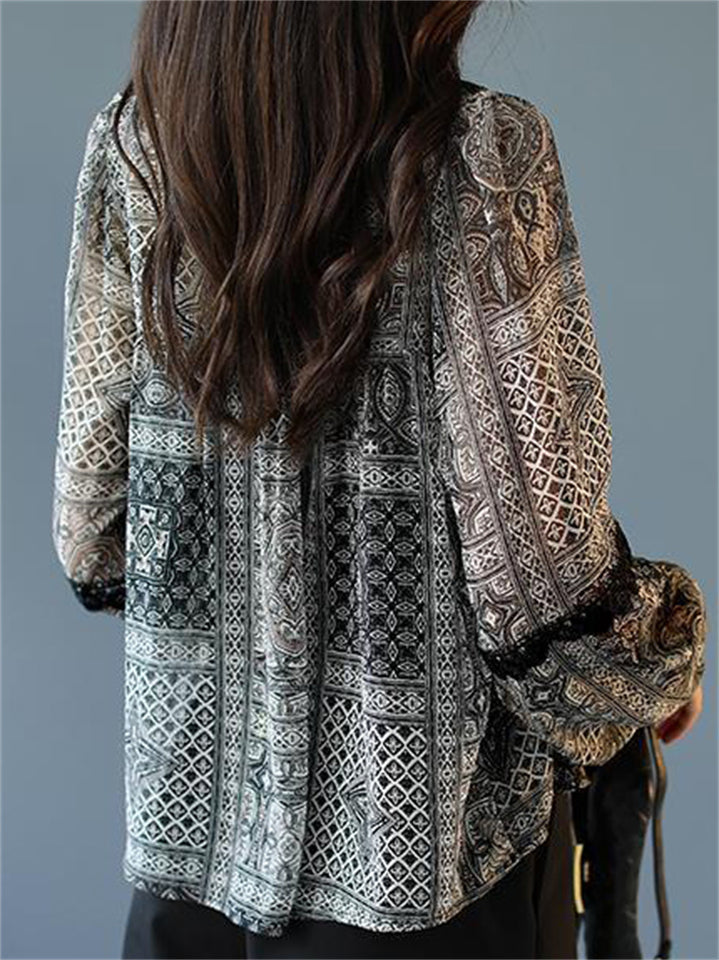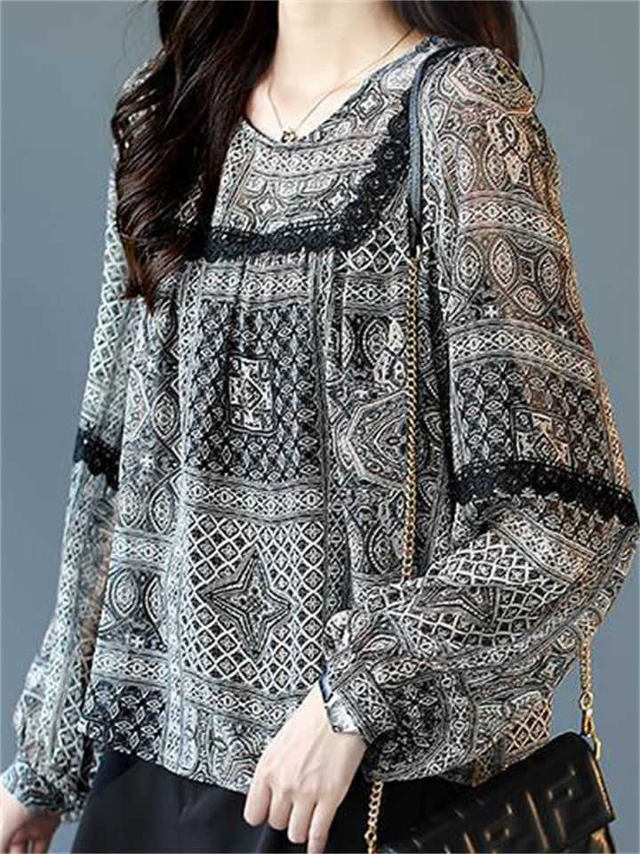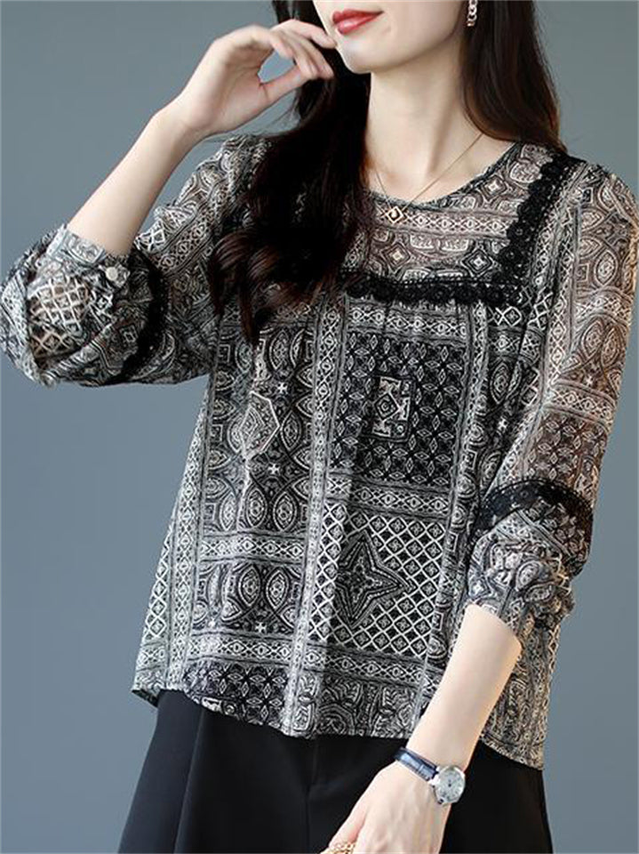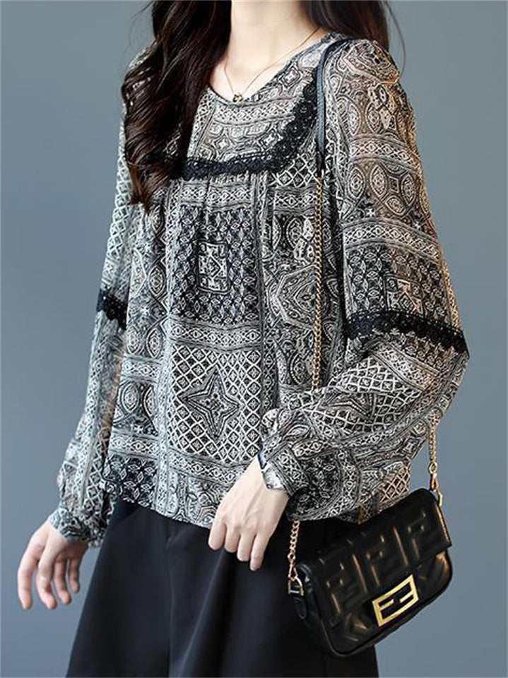 Women's Loose Black Print O-Neck Lace Trim Chiffon Shirt