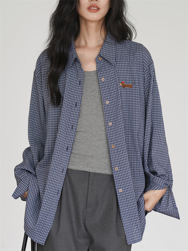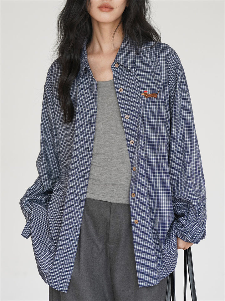 Women's Loose Blue Plaid Long Sleeve Shirts