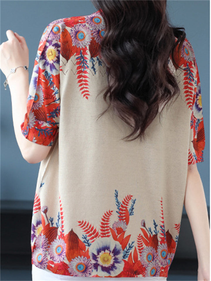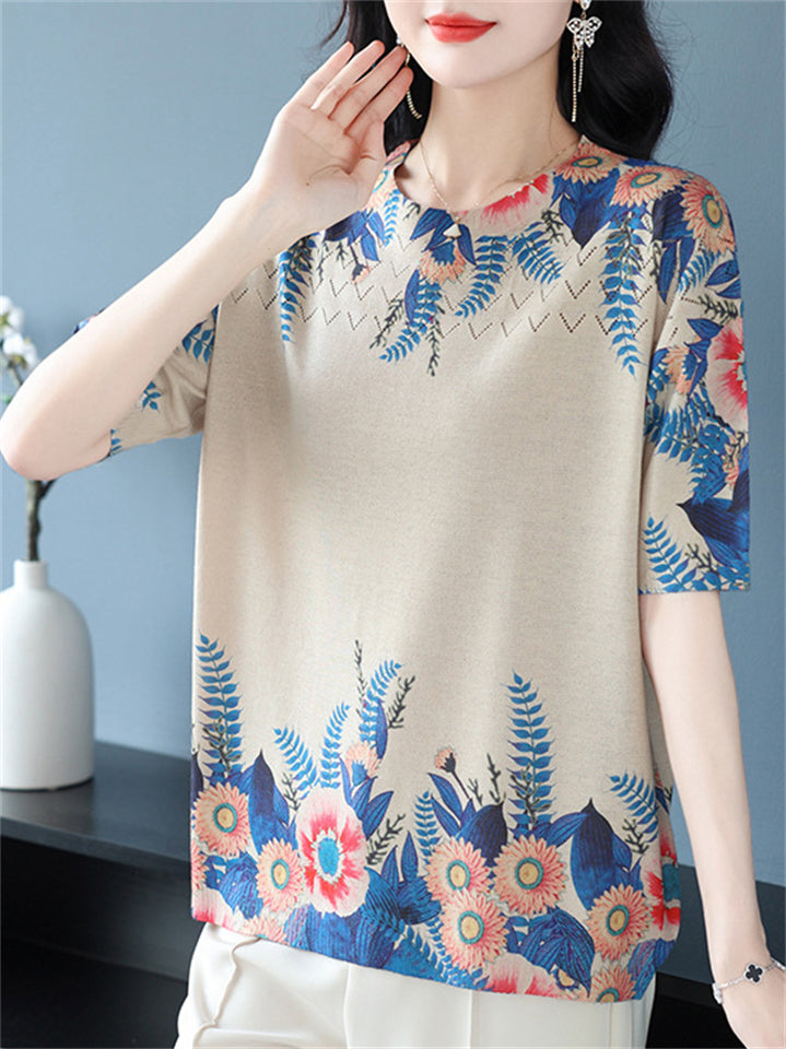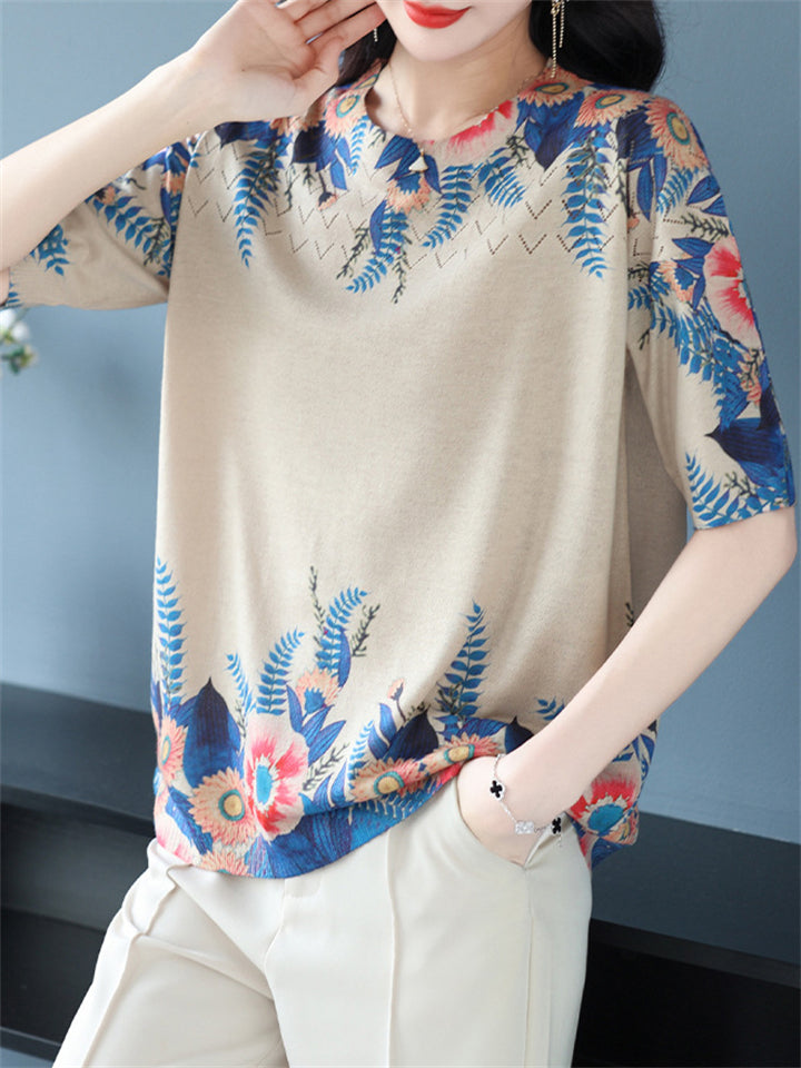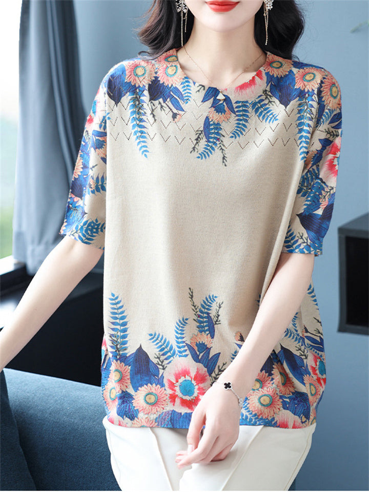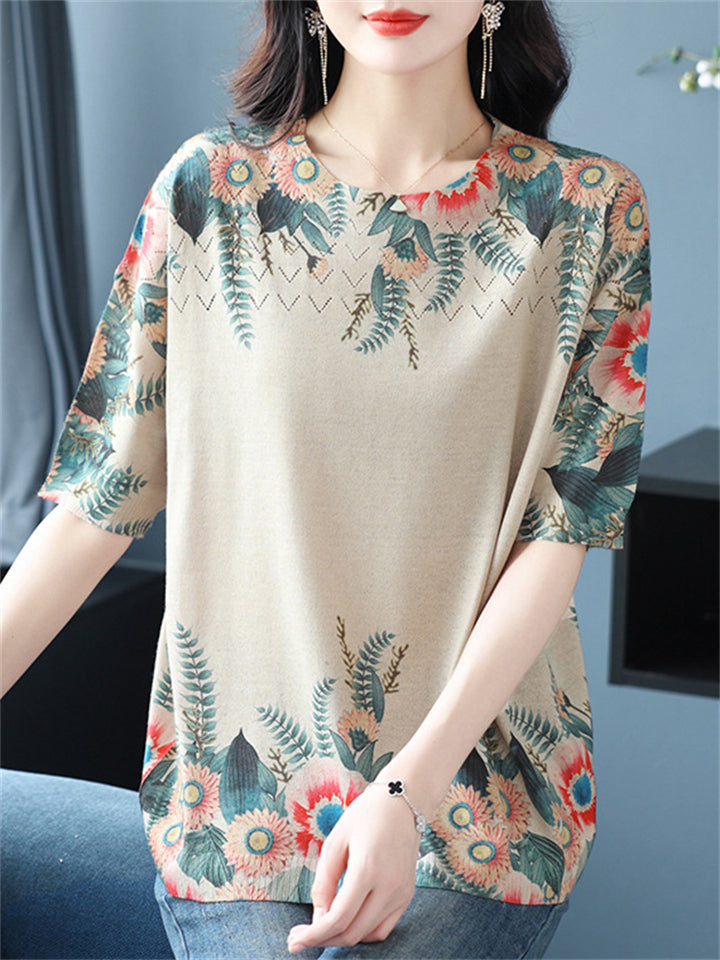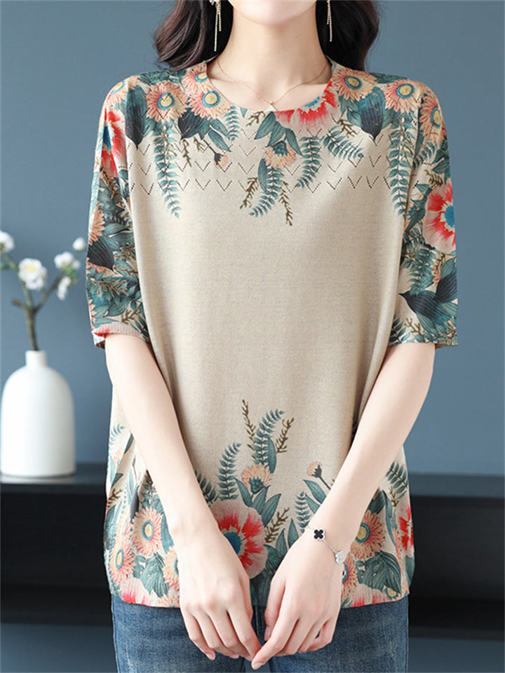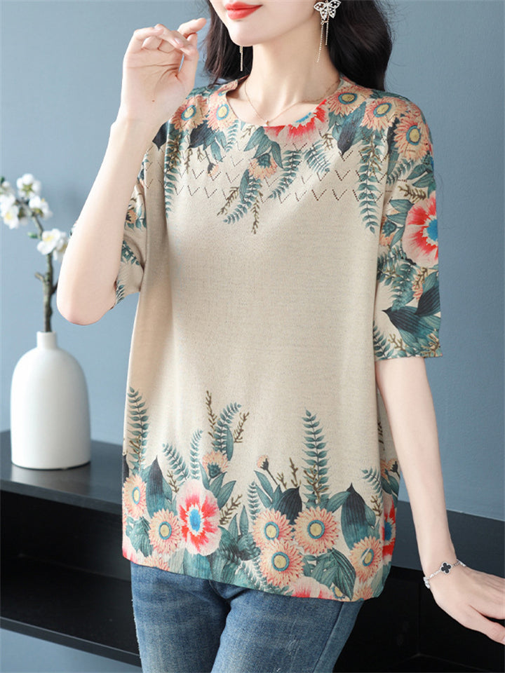 Women's Loose Floral Print Short Sleeve Knit T-Shirts