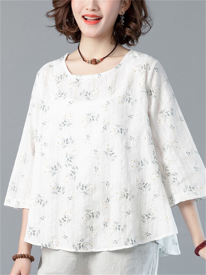 Ladies Ethnic Style Floral Embroidery Round Neck Shirts