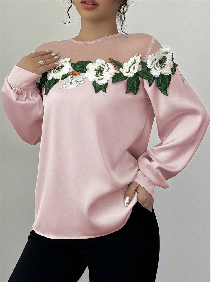 Women's Pink Mesh Patchwork Embroidered Long Sleeve Shirts