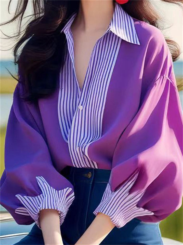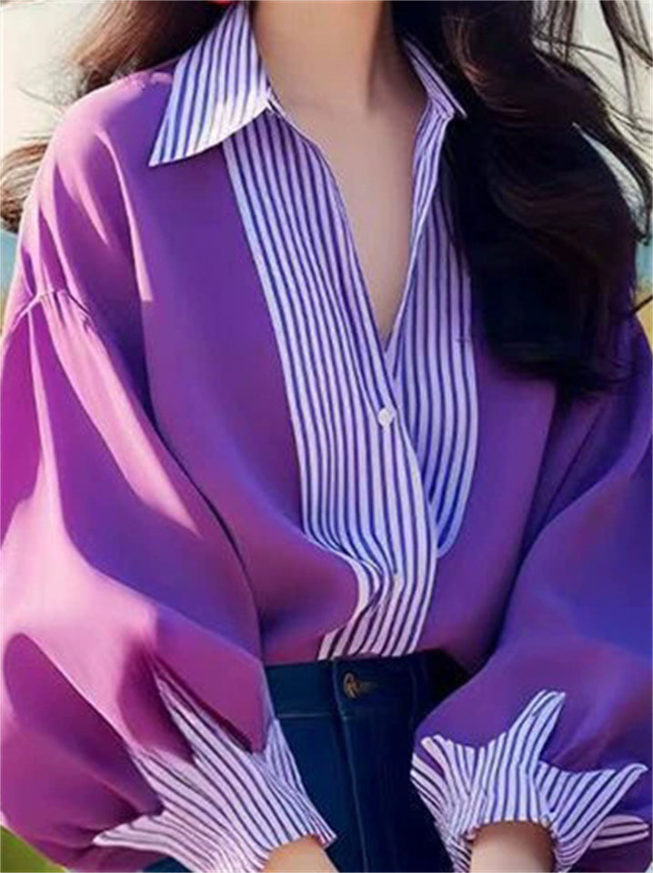 Women's Purple Striped Patchwork Lapel Lantern Long Sleeve Shirts