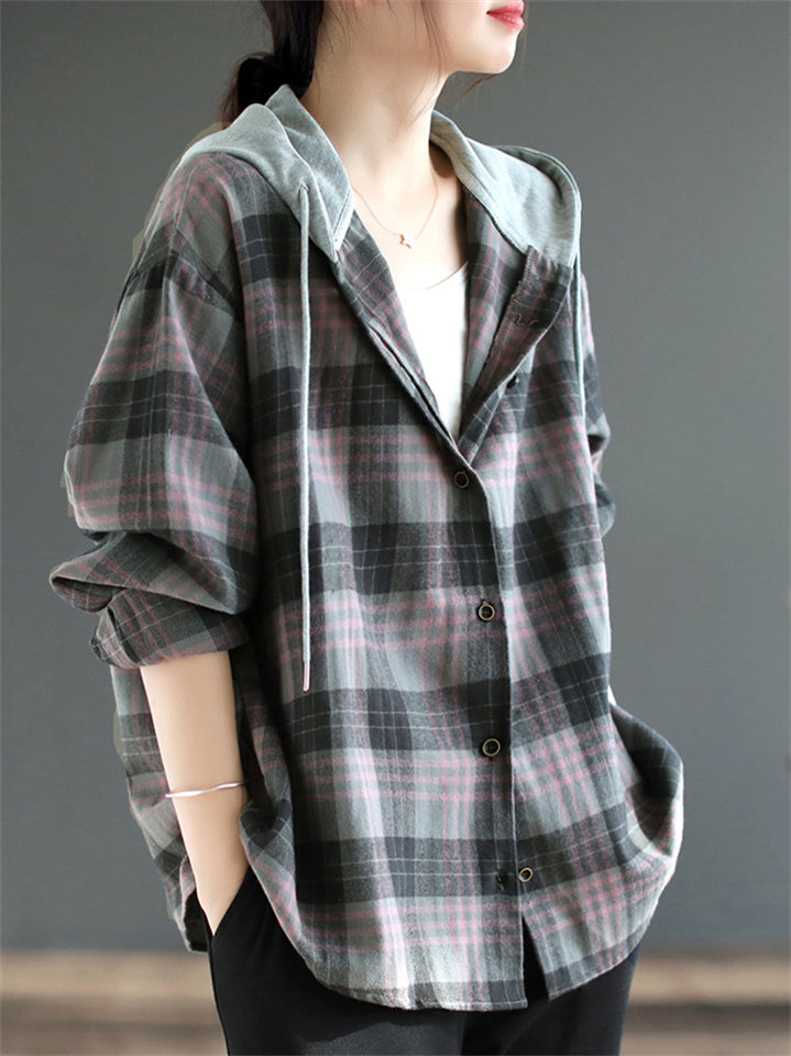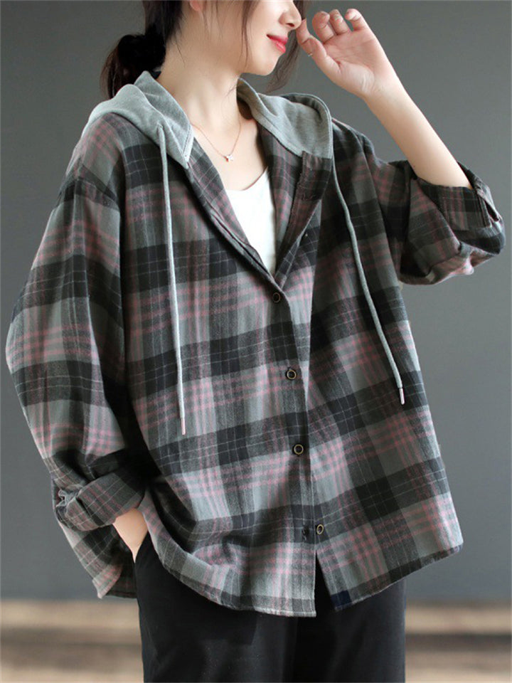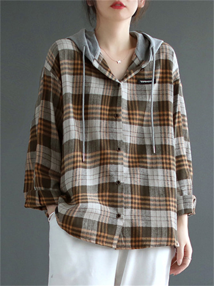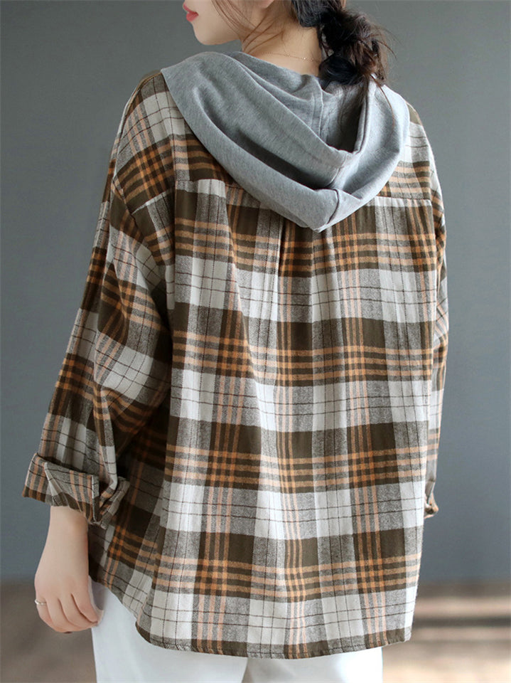 Women's Retro Plaid Contrast Color Long Sleeve Hooded Shirts