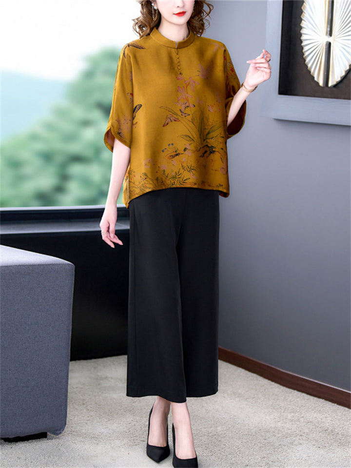 Lady Stand-up Collar Floral Printed Chinese Style Shirts