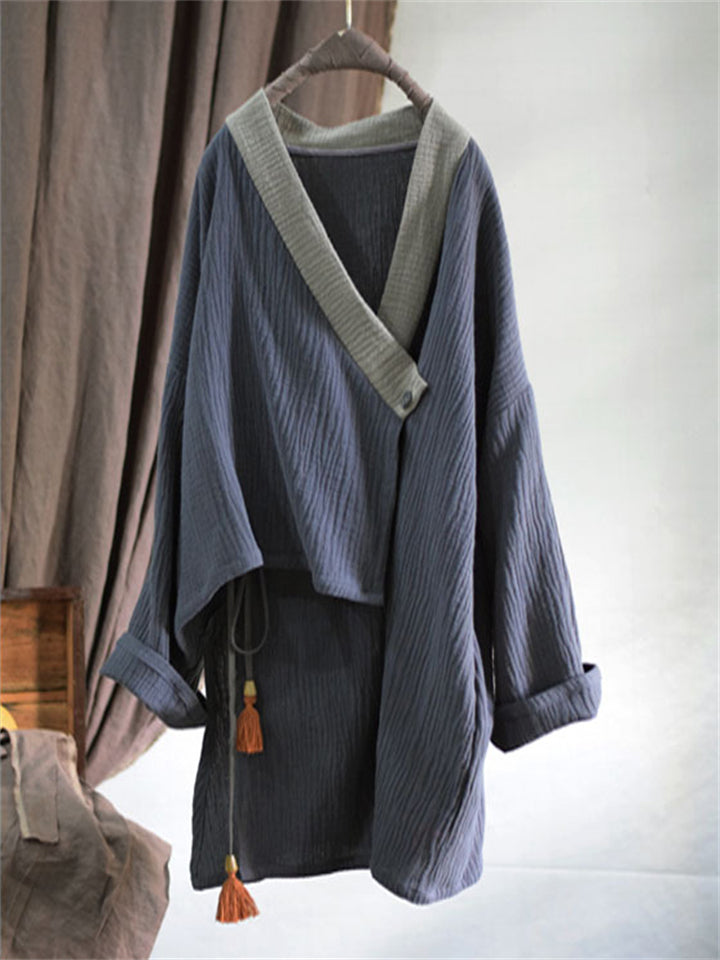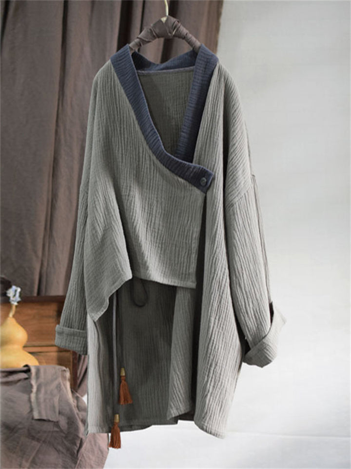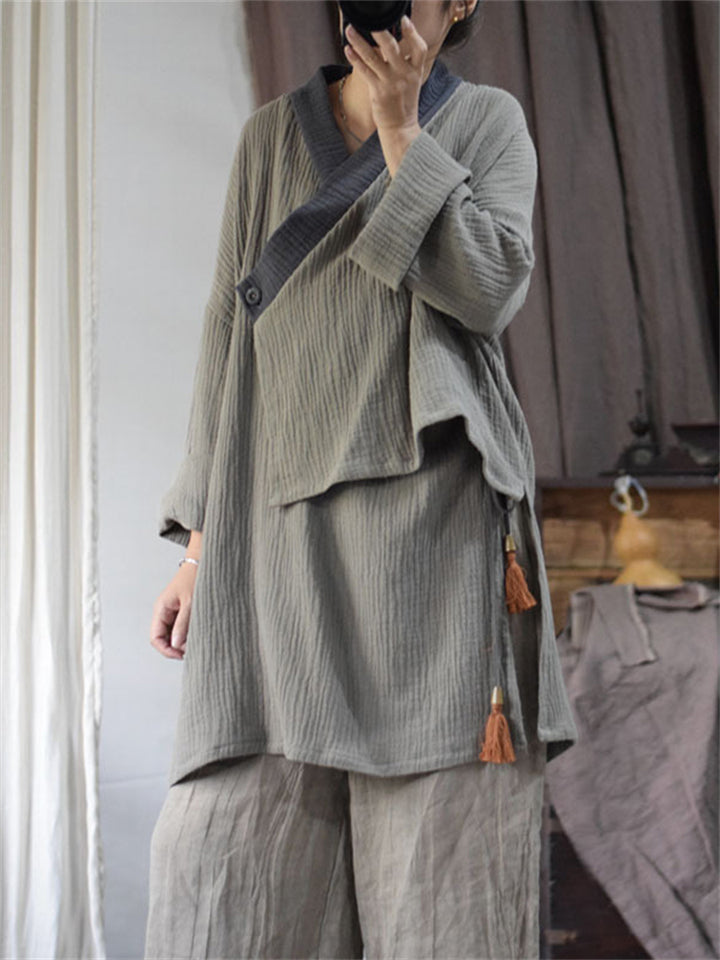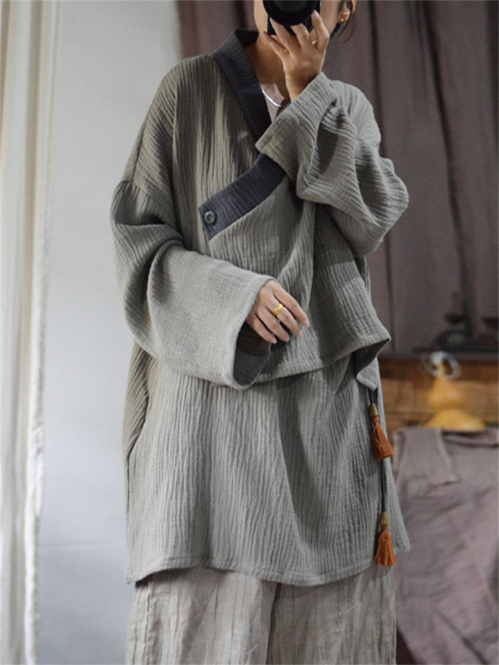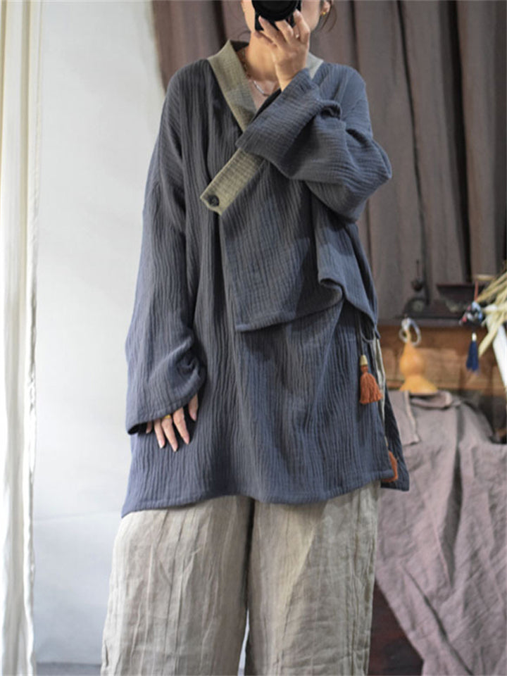 Women's Retro Textured Tassel Lace-Up Zen Style Shirts