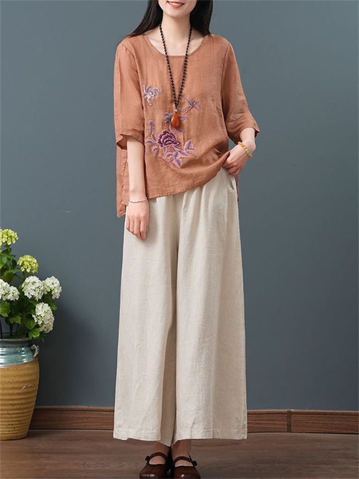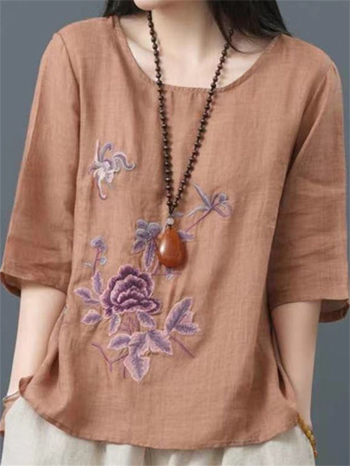 Ladies Ethnic Style Floral Embroidery Round Neck Shirts