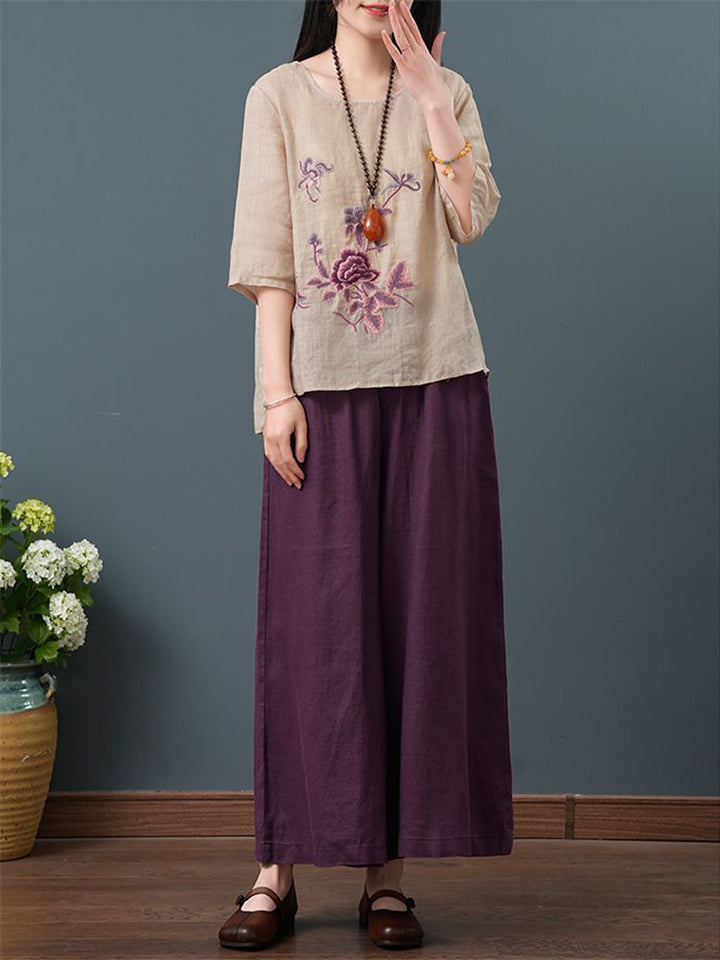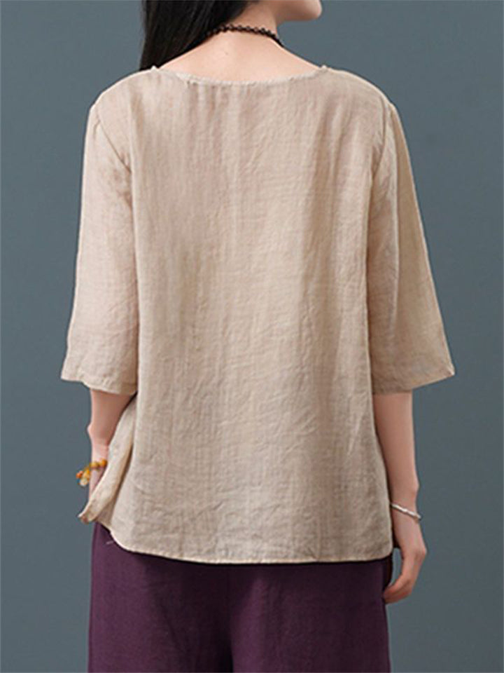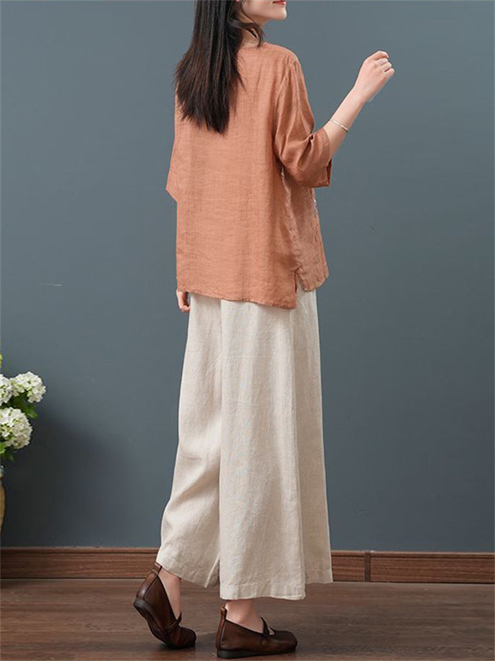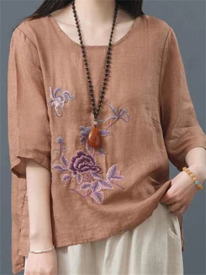 Ancient Chinese Style Floral Embroidery Linen Shirt for Women