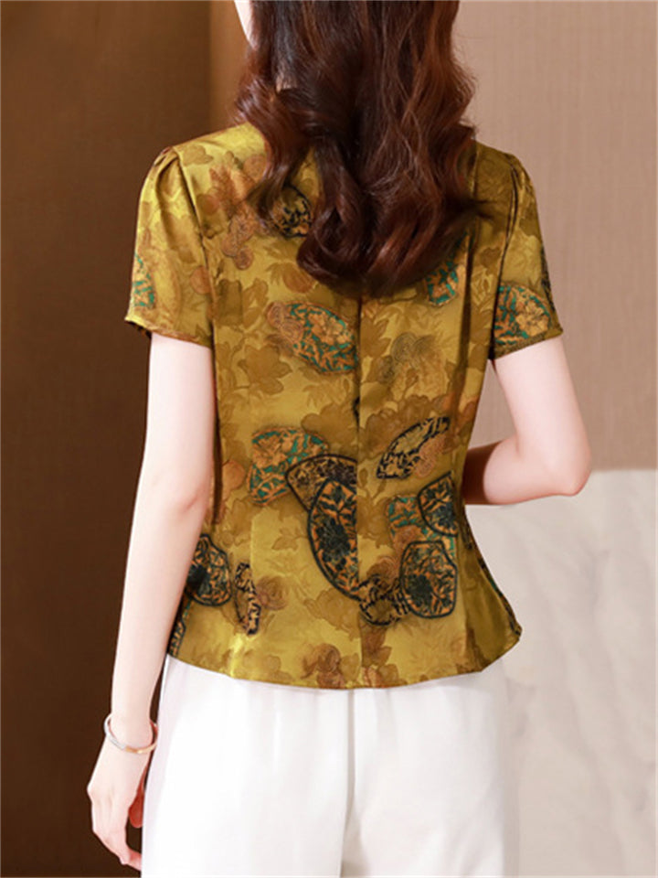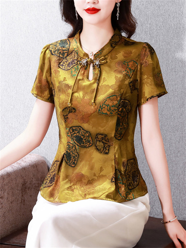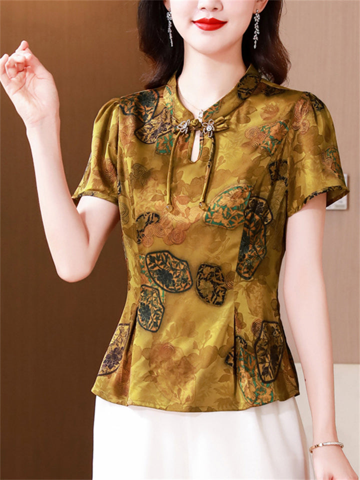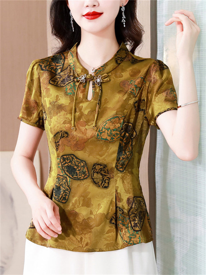 Lady Stand-up Collar Floral Printed Chinese Style Shirts