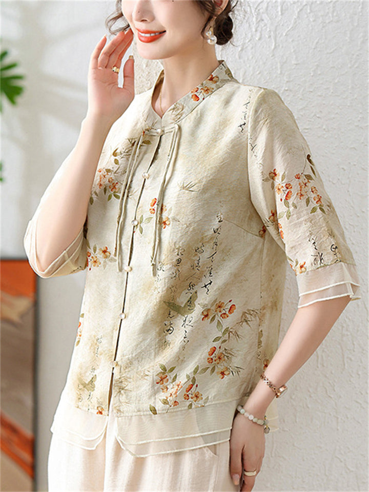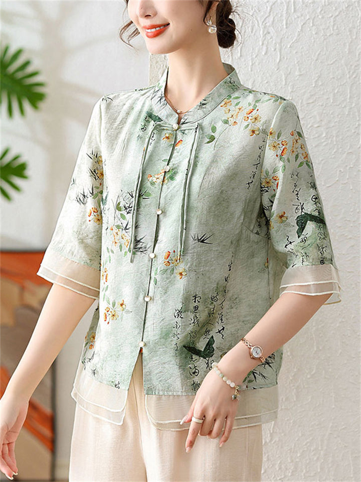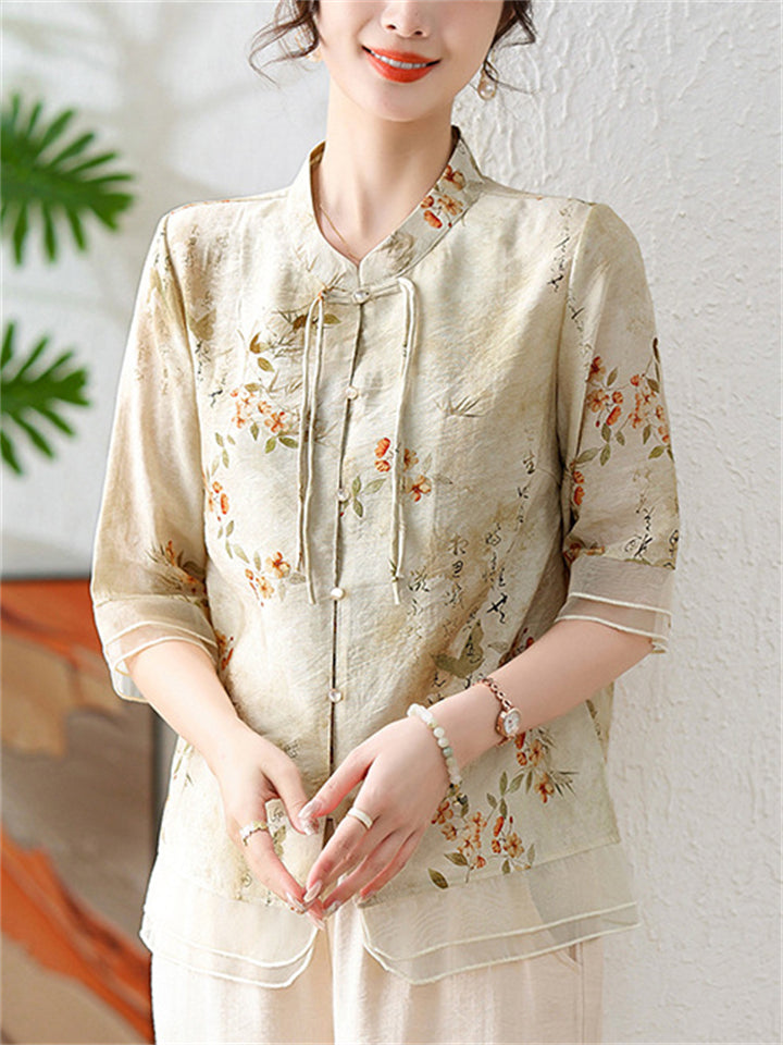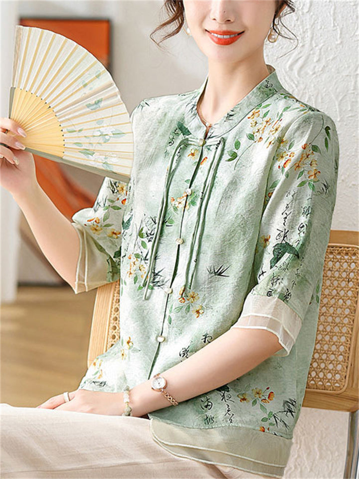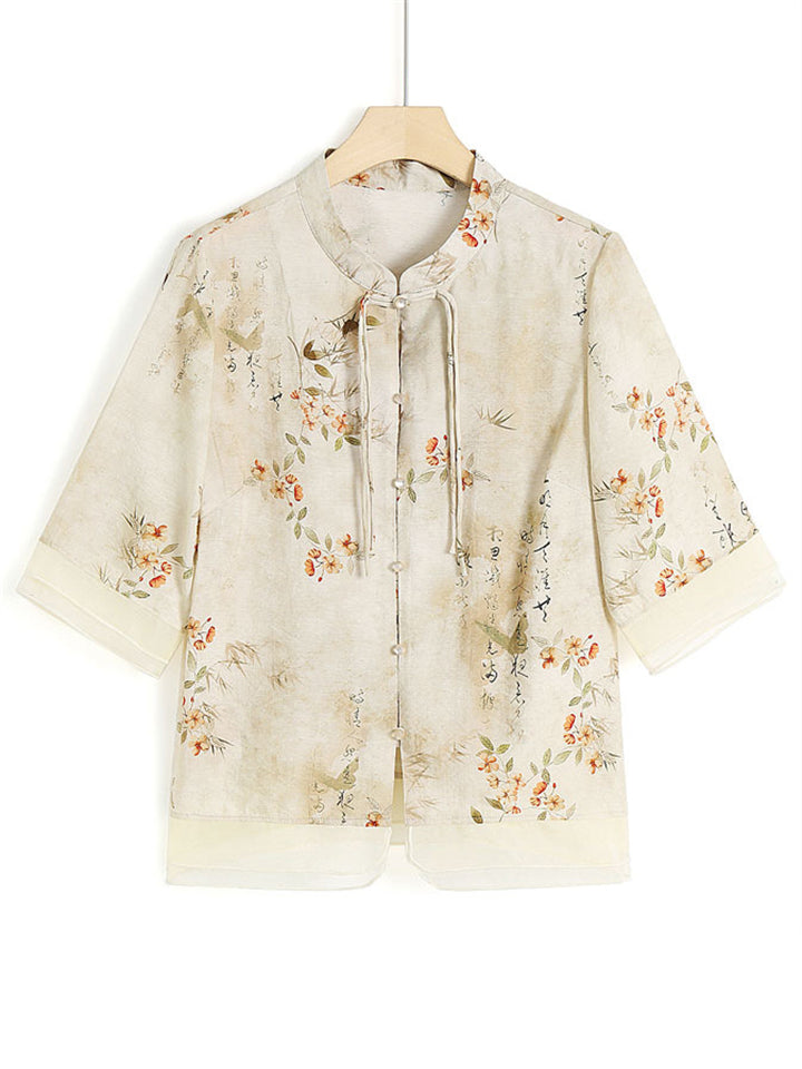 Lady Stand-up Collar Floral Printed Chinese Style Shirts