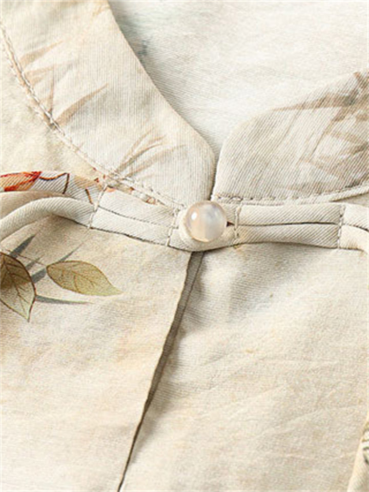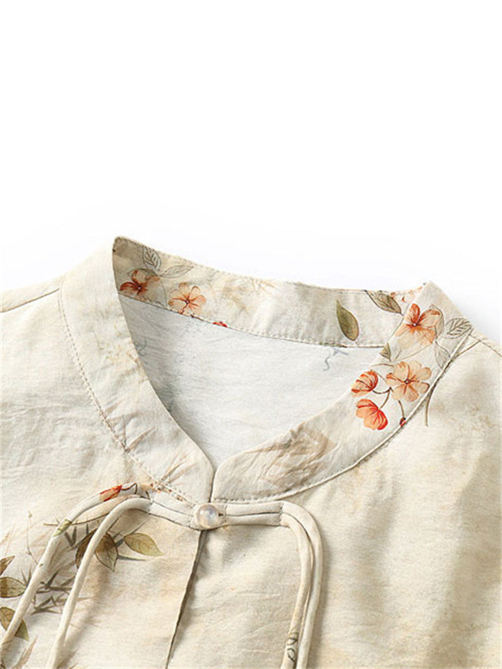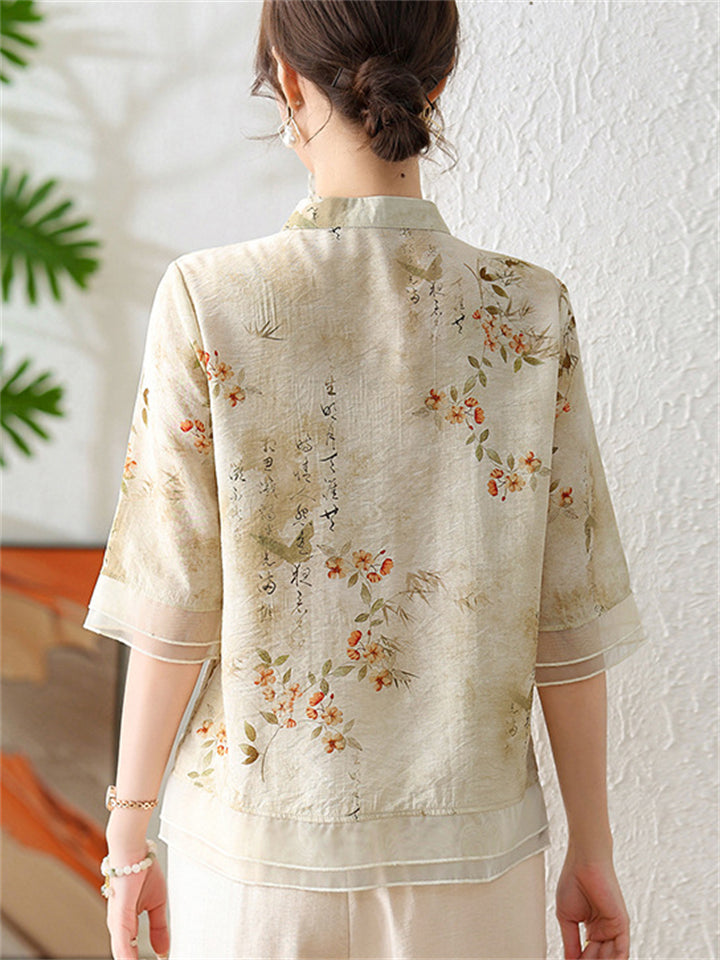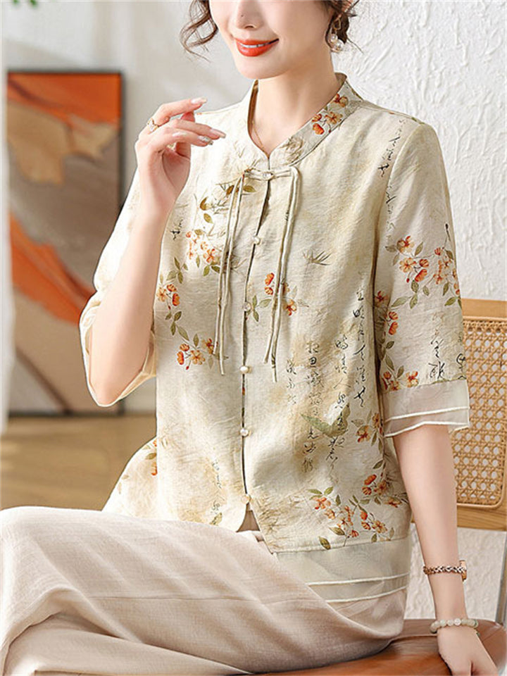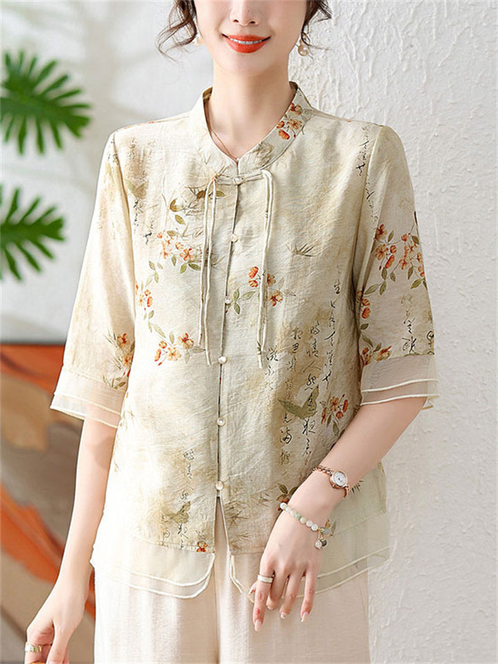 Lady Stand-up Collar Floral Printed Chinese Style Shirts