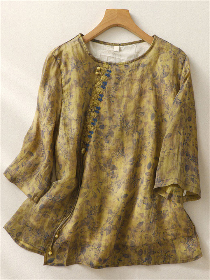 Ancient Chinese Style Floral Embroidery Linen Shirt for Women