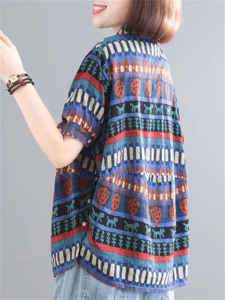 Summer Bohemian Style V Neck Print Vacation Shirt for Women