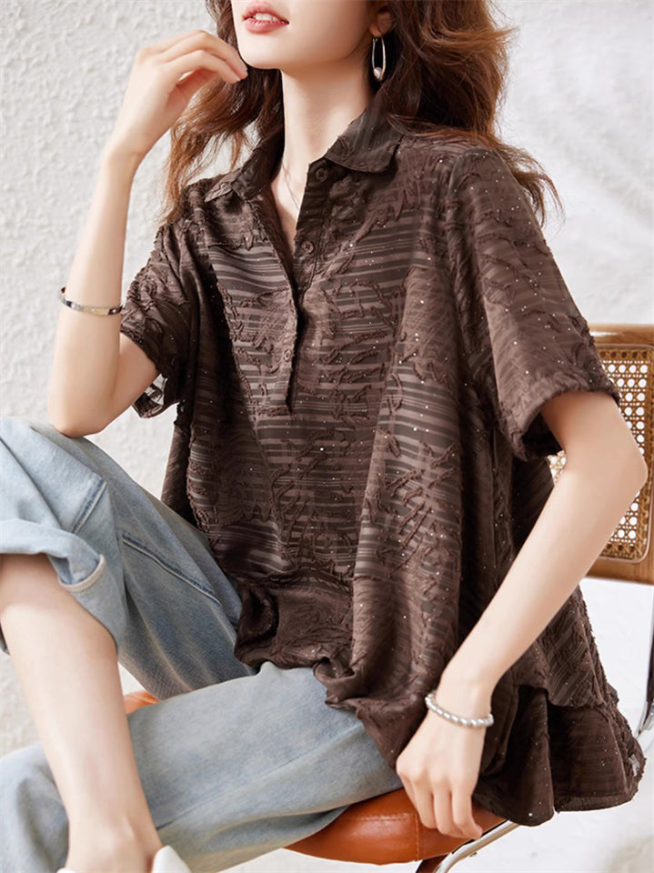 Women's Summer Polo Neck Sequin Jacquard Short Sleeve Shirt