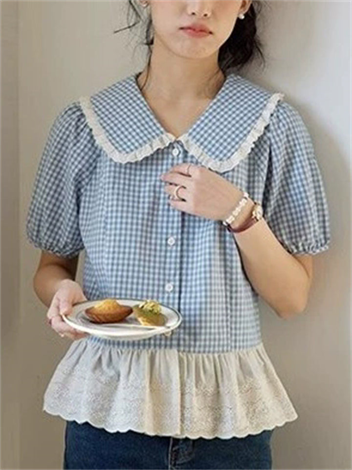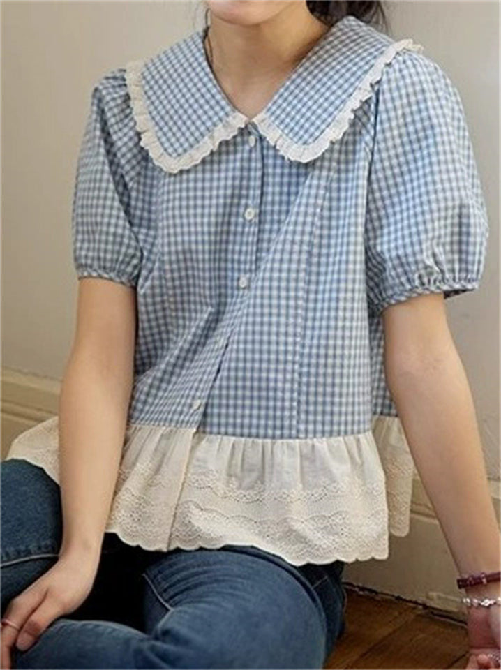 Women's Summer Retro Blue Plaid Lace Patchwork Short Sleeve Shirts