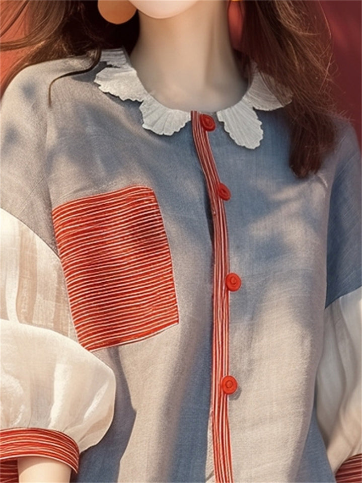 Women's Sweet Style Contrast Color Patchwork Lantern Sleeve Shirts