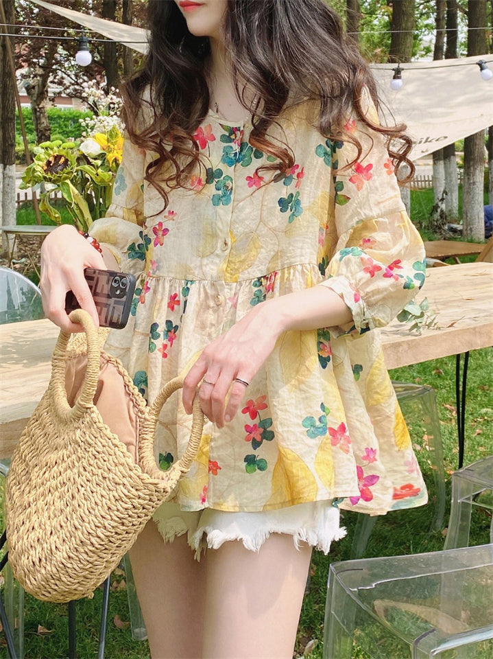 Women's Sweet Style Yellow Floral Printed Fluffy Half Sleeve Shirts