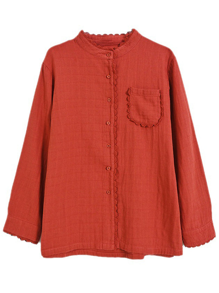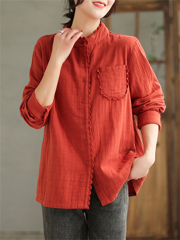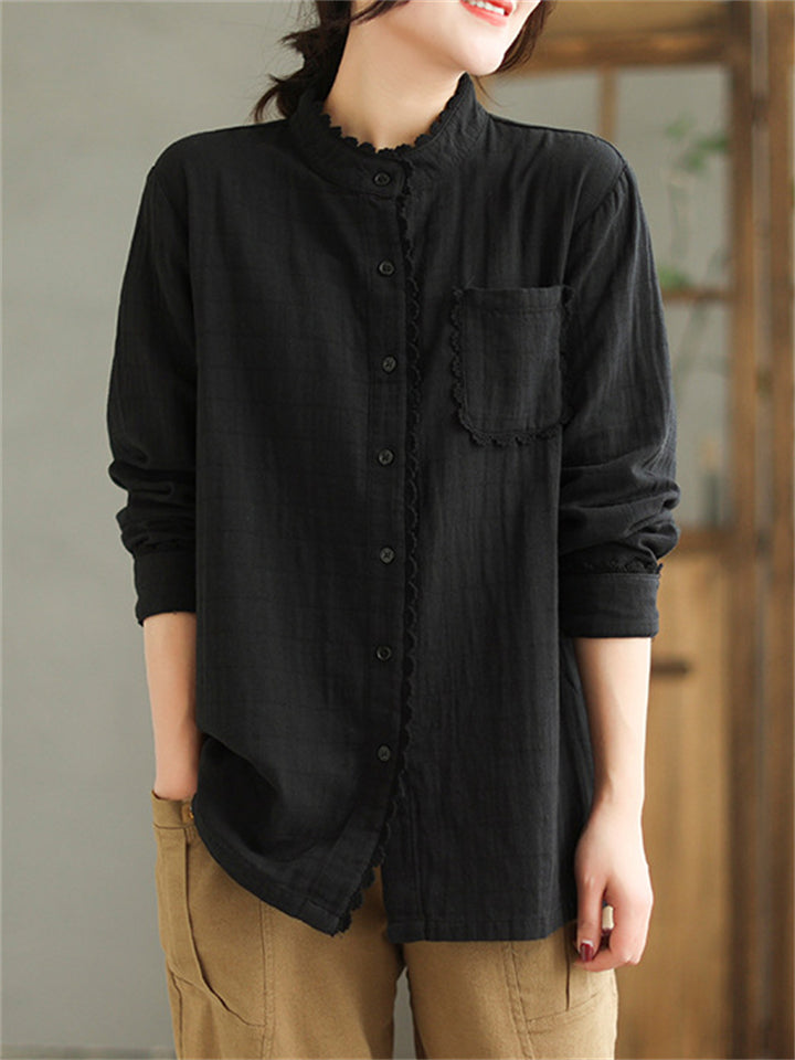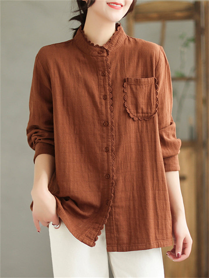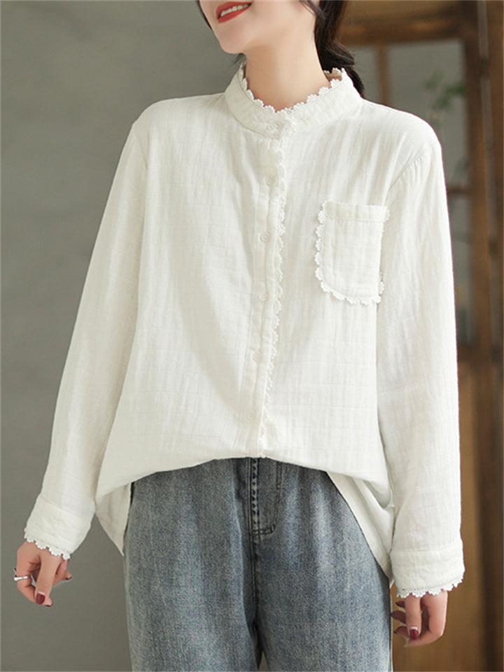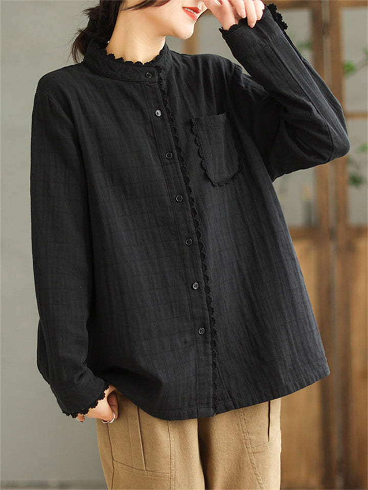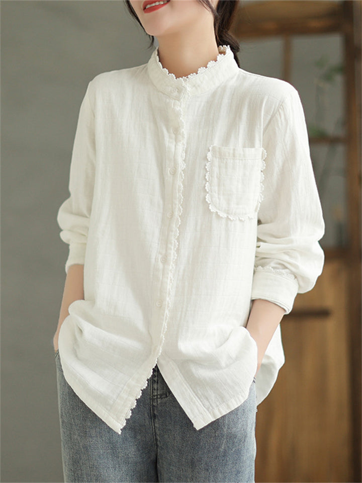 Women's Elegant Autumn Cotton Striped Hollow Stand Collar Long Sleeve Shirts