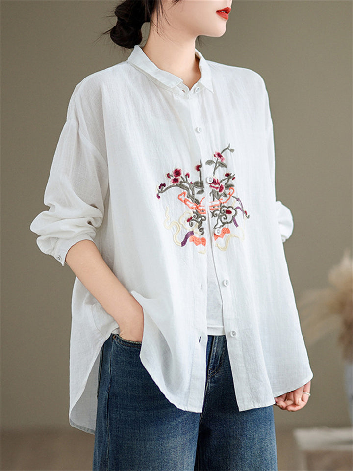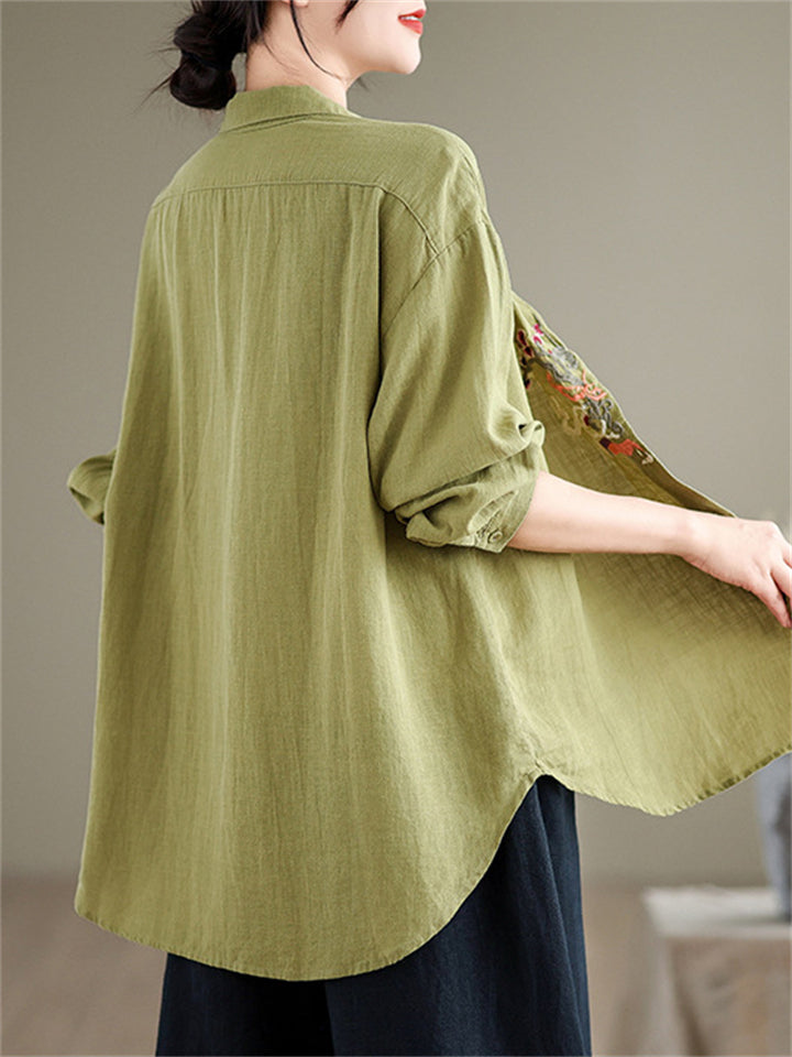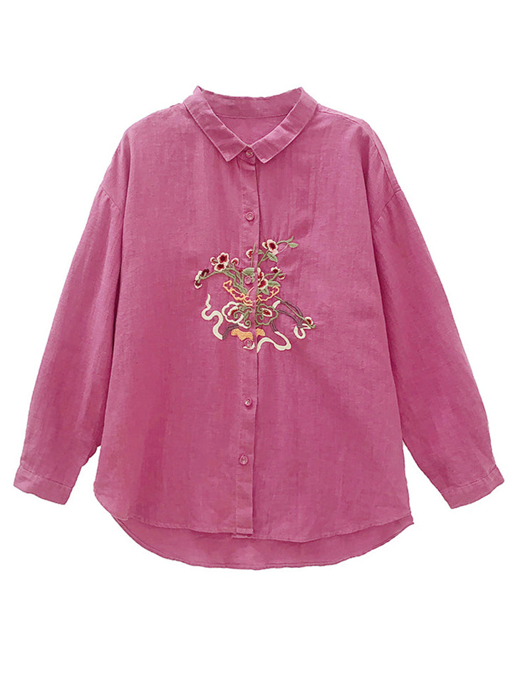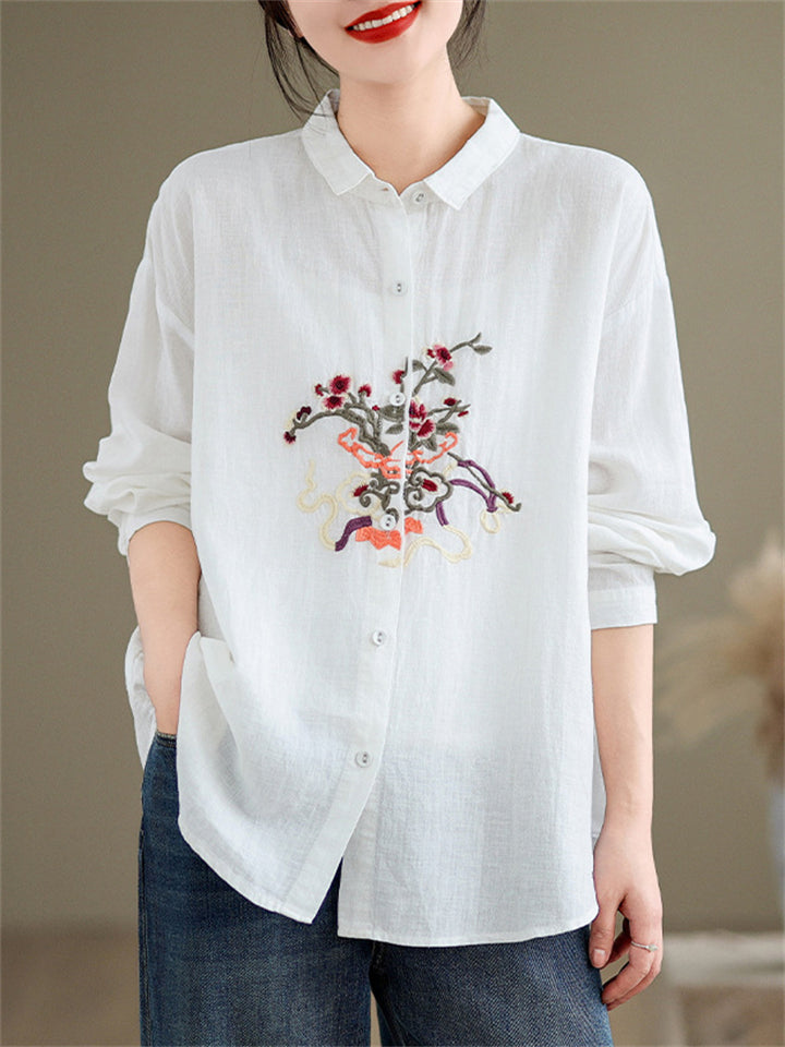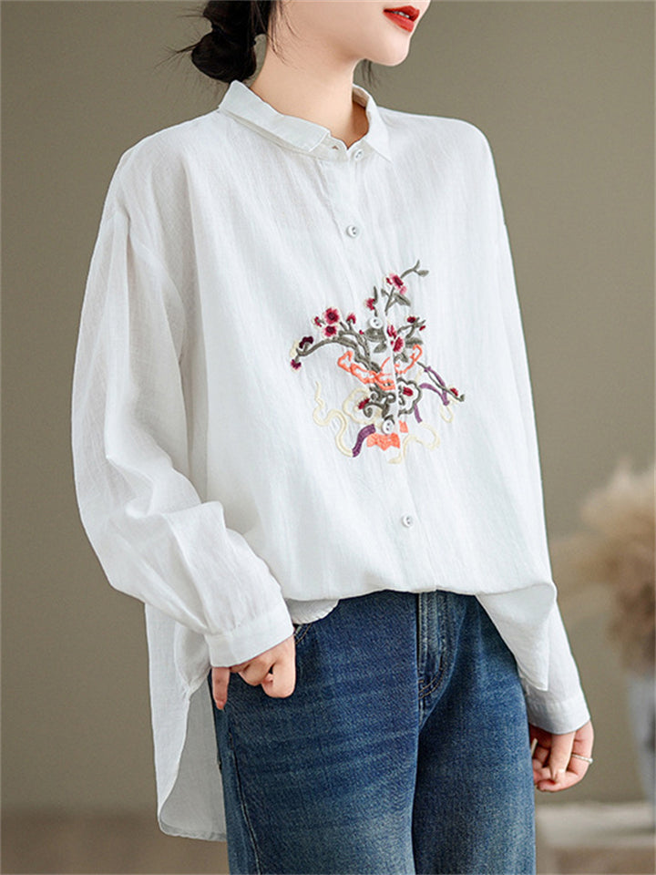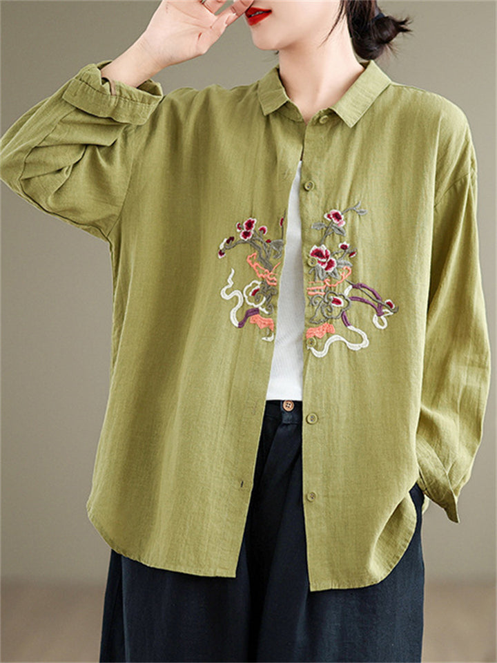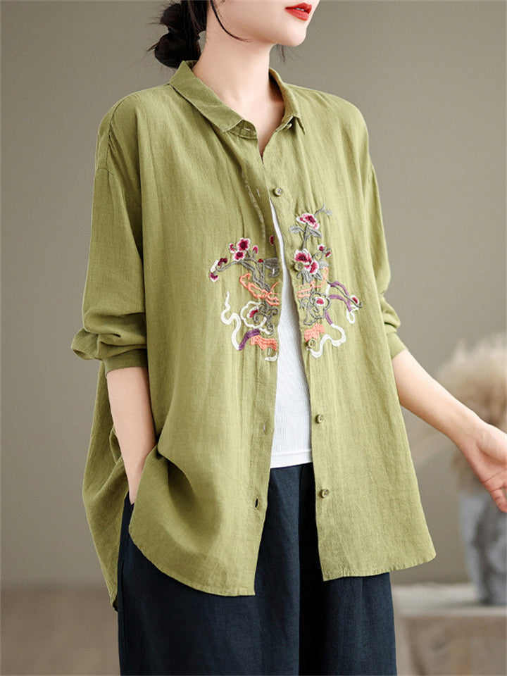 Ancient Chinese Style Floral Embroidery Linen Shirt for Women