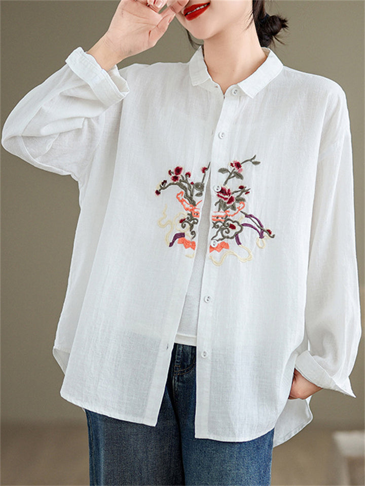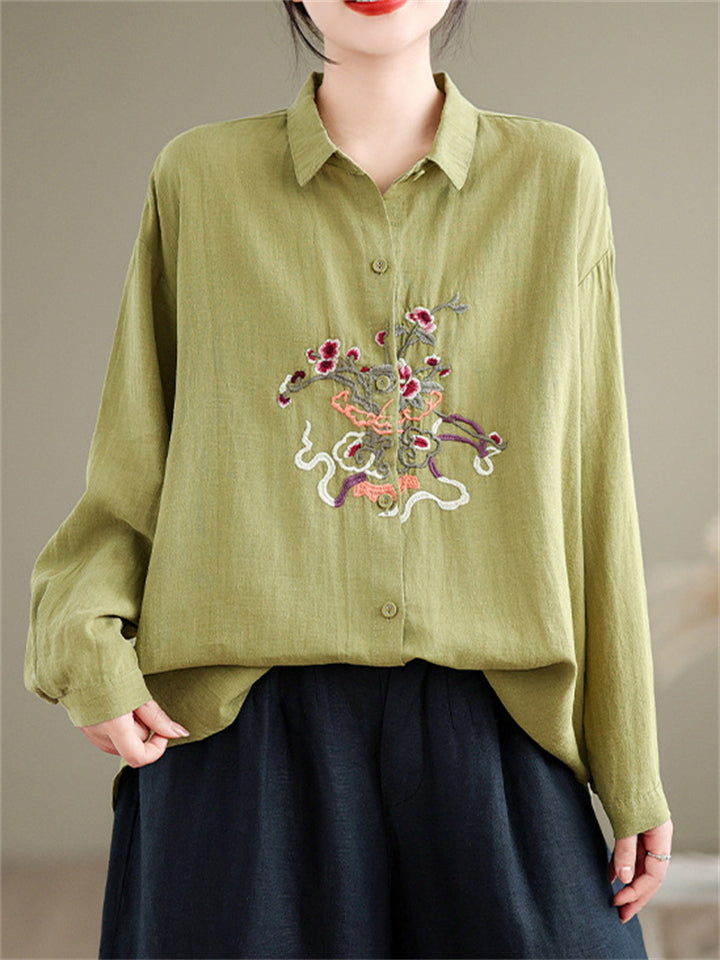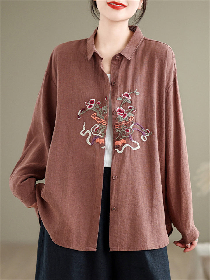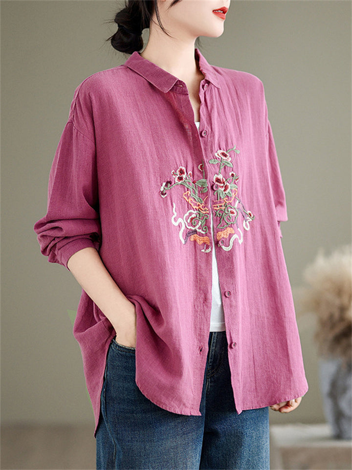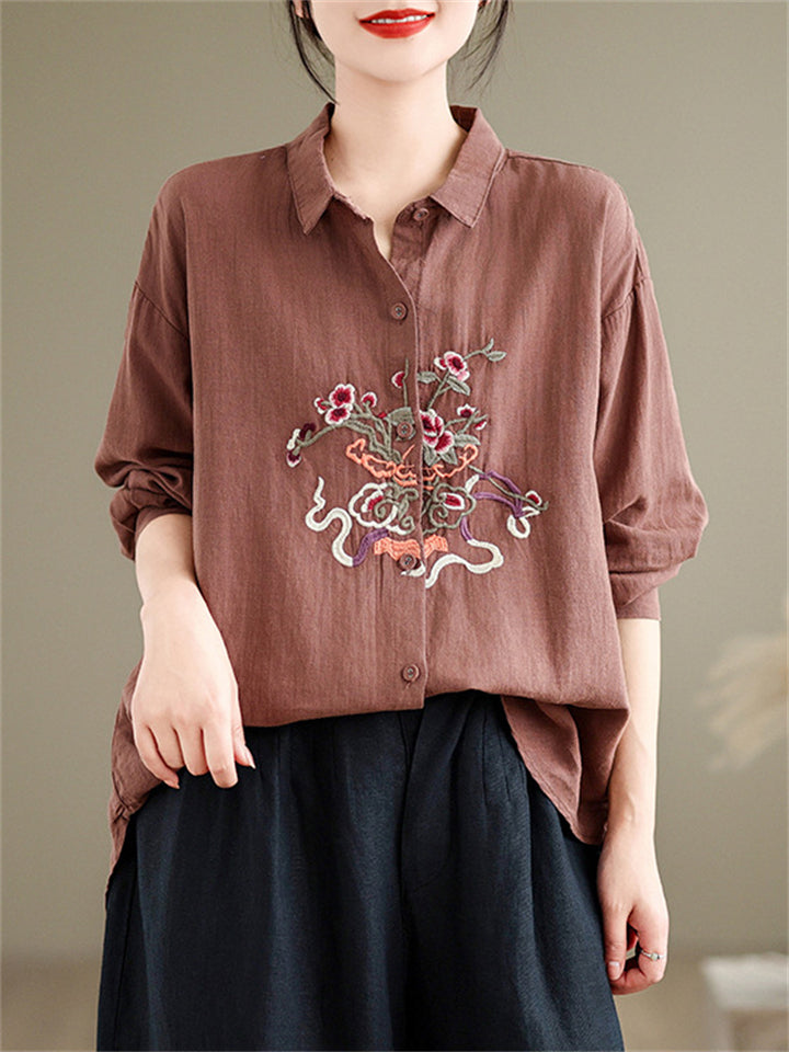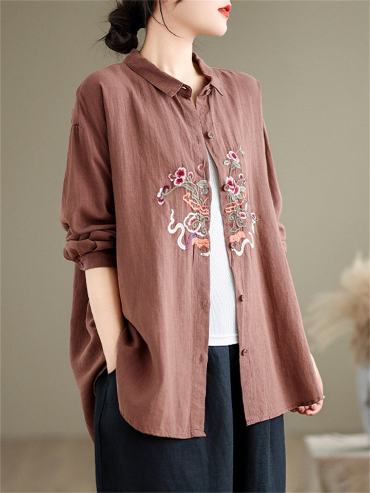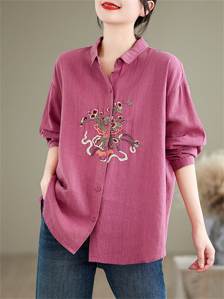 Women's Vibrant Flowers Embroidered Turn-down Collar Shirt