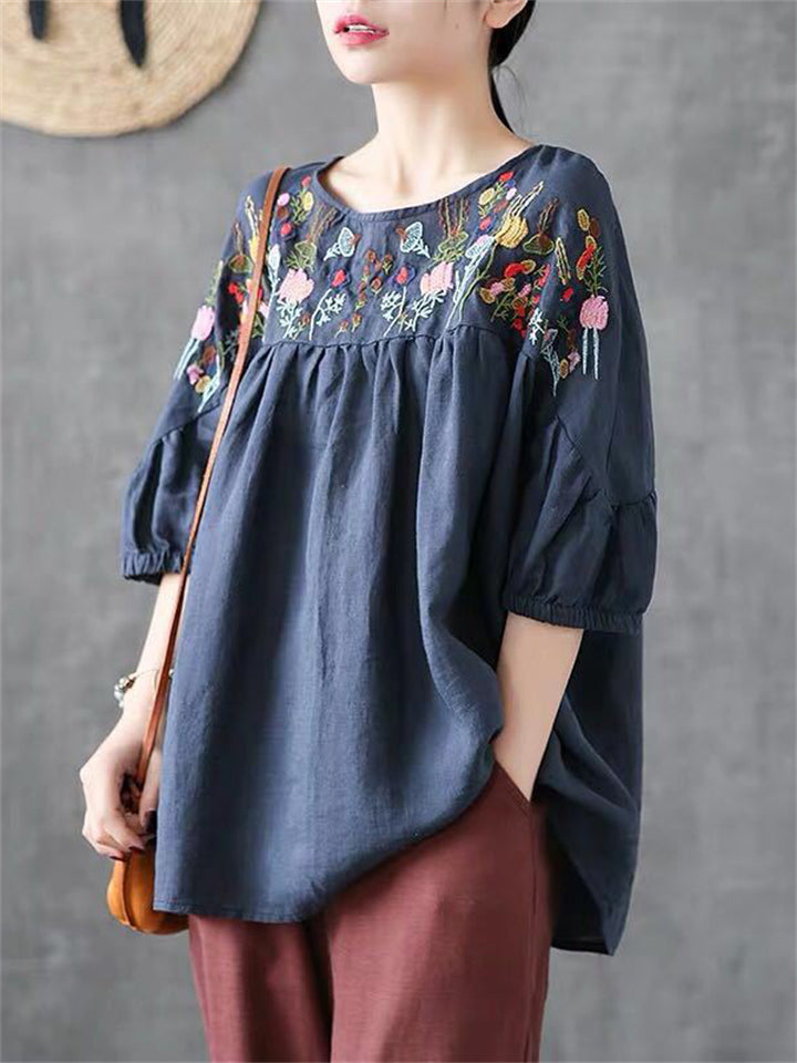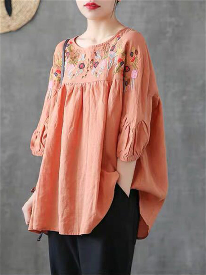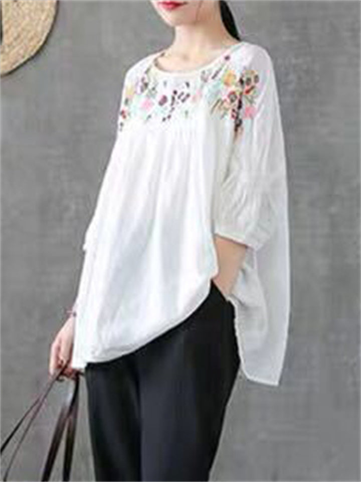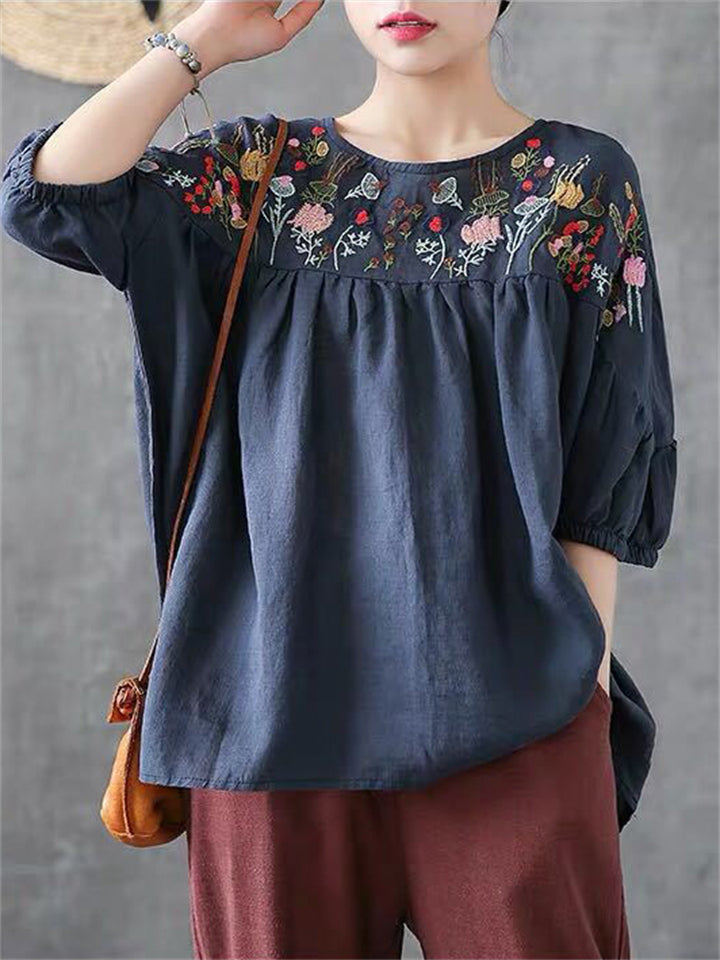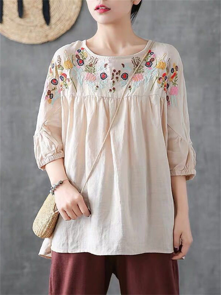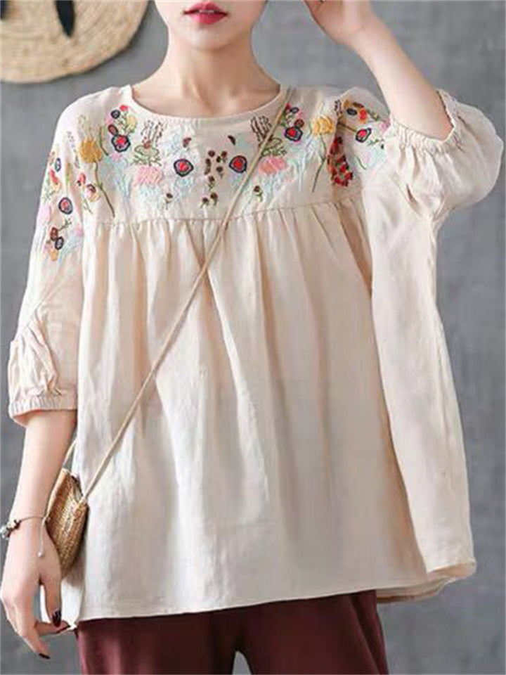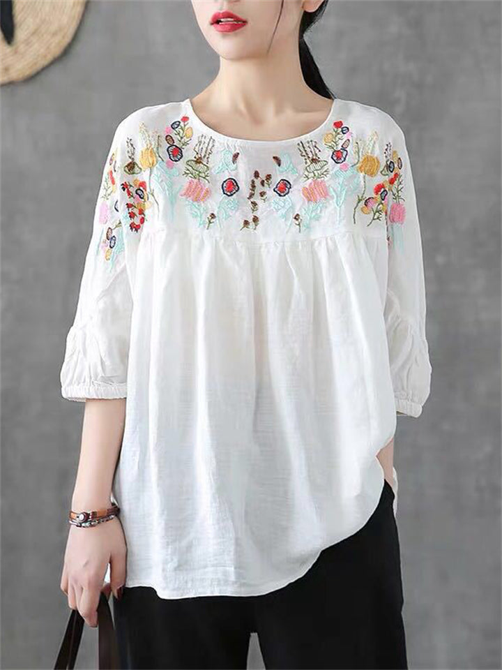 Ladies Ethnic Style Floral Embroidery Round Neck Shirts