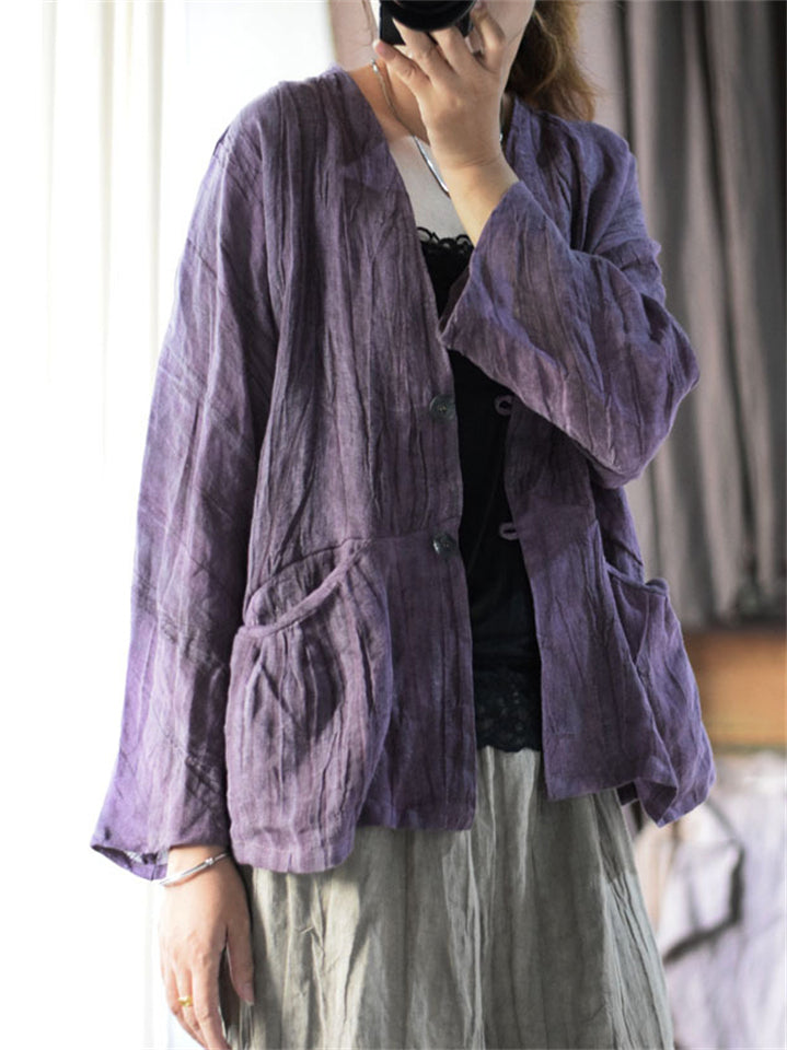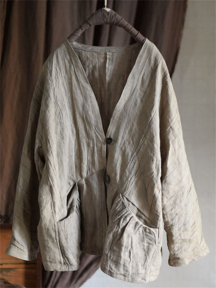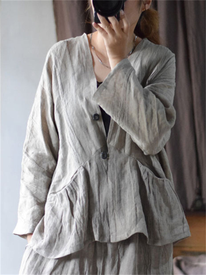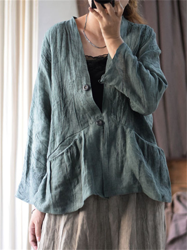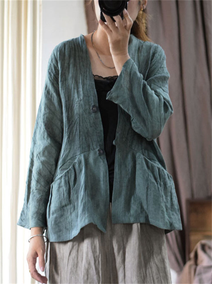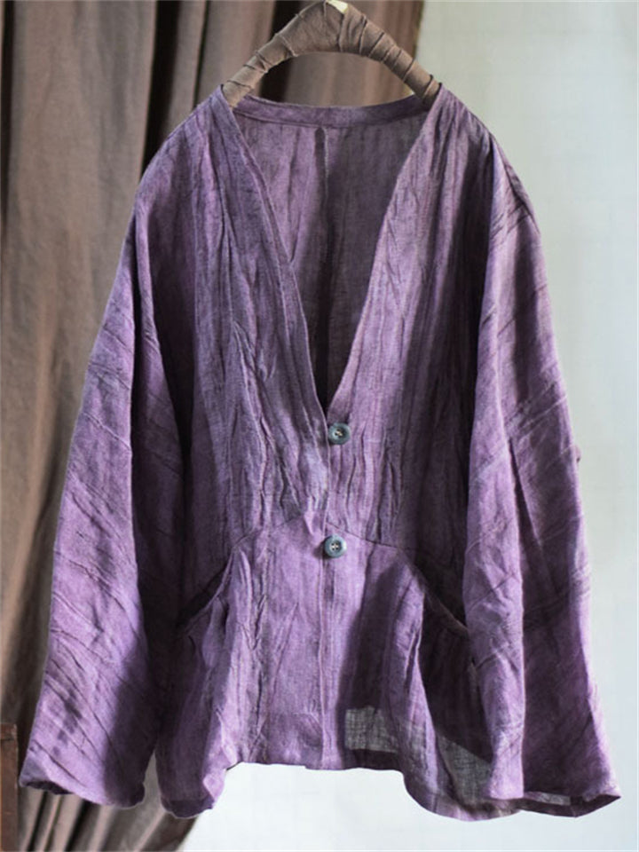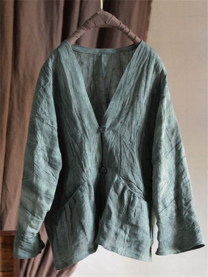 Women's Vintage V-Neck Loose Linen Texture Long Sleeve Shirts
