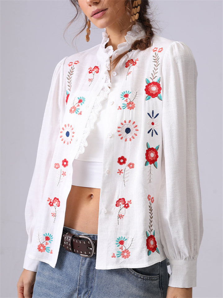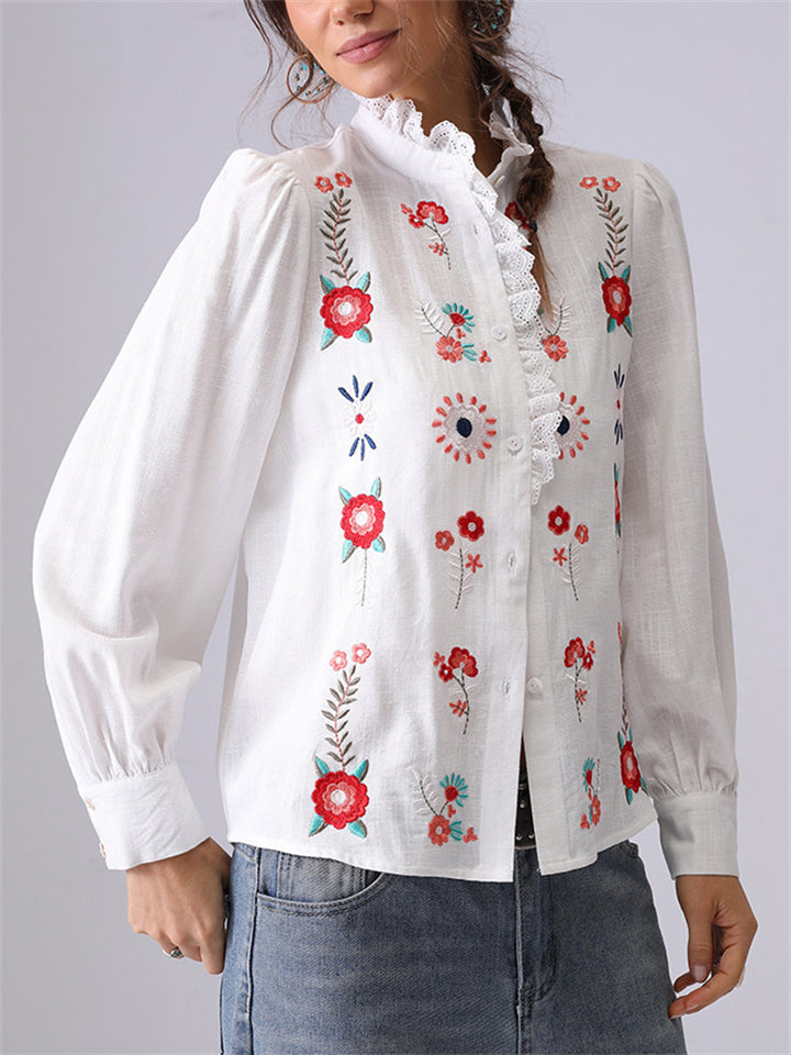Women's White French Style Flowers Embroidery Ruffled Shirt