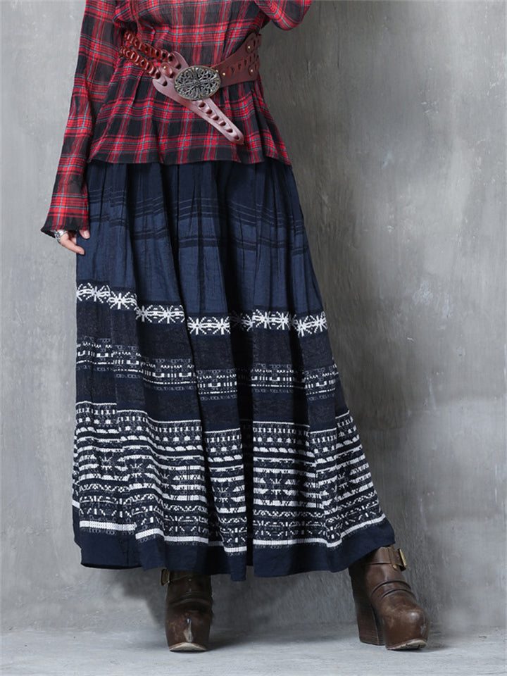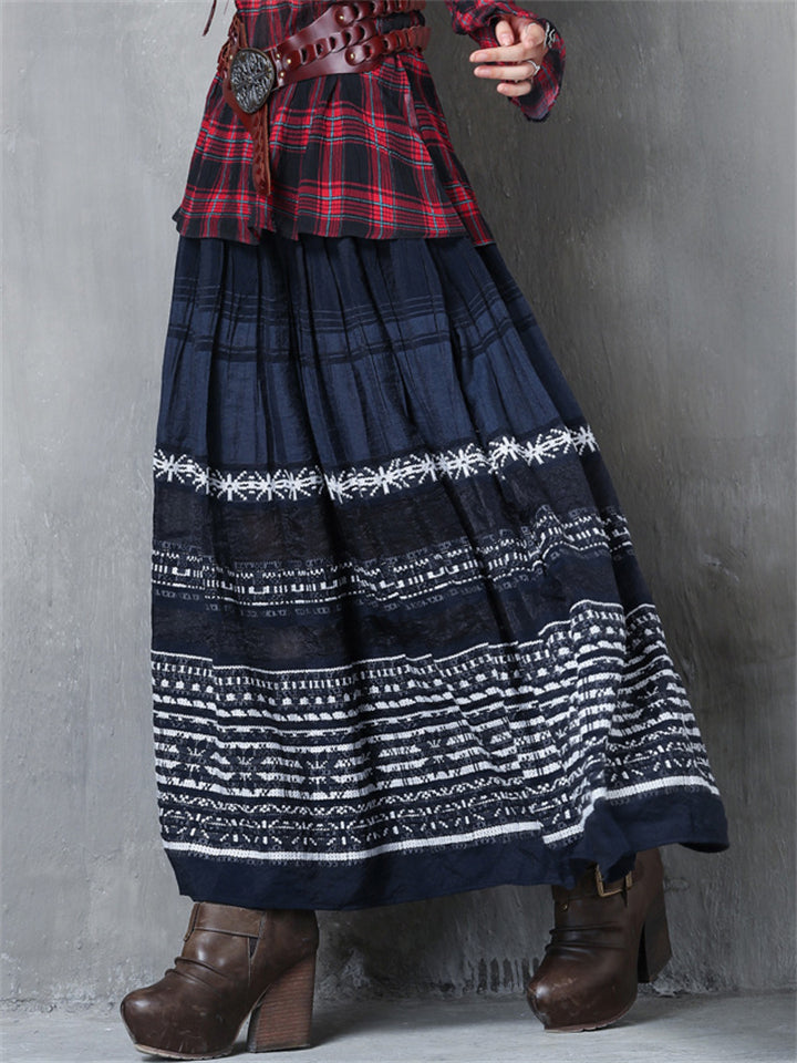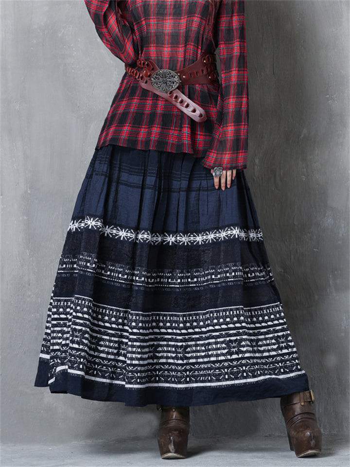 Elstic-waist Pleated Skirt Embroidery Long Skirt