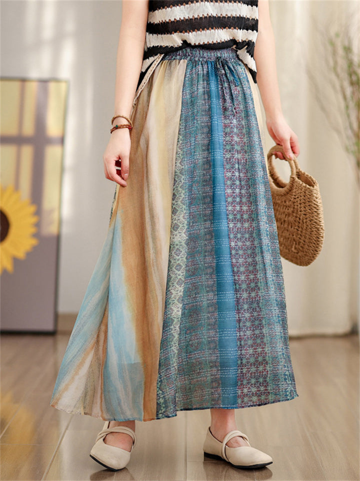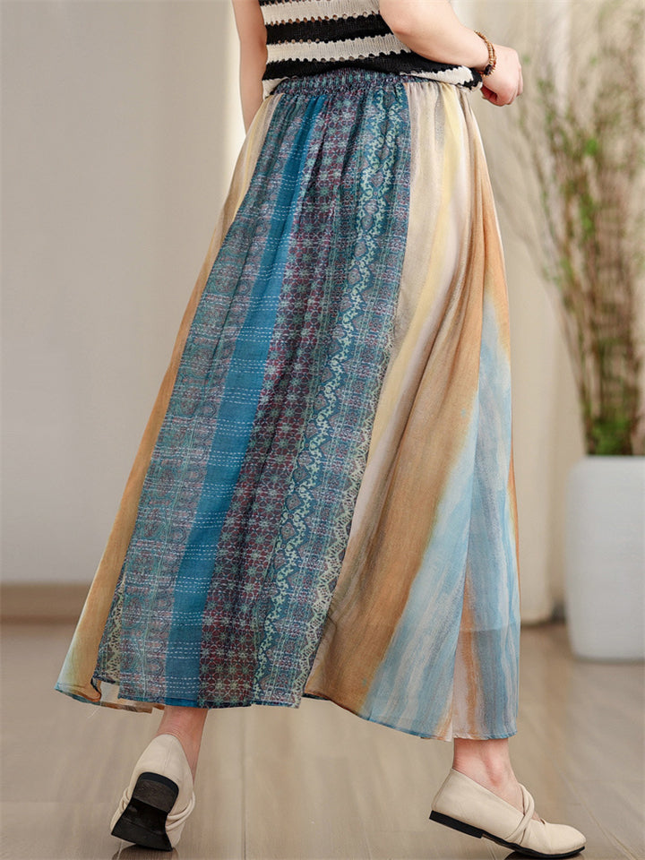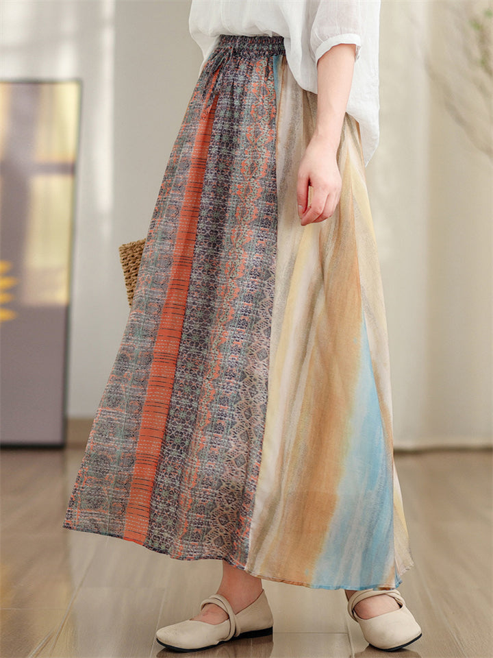 Summer Boho A-Line Contrast Color Elastic Waist Skirts for Women