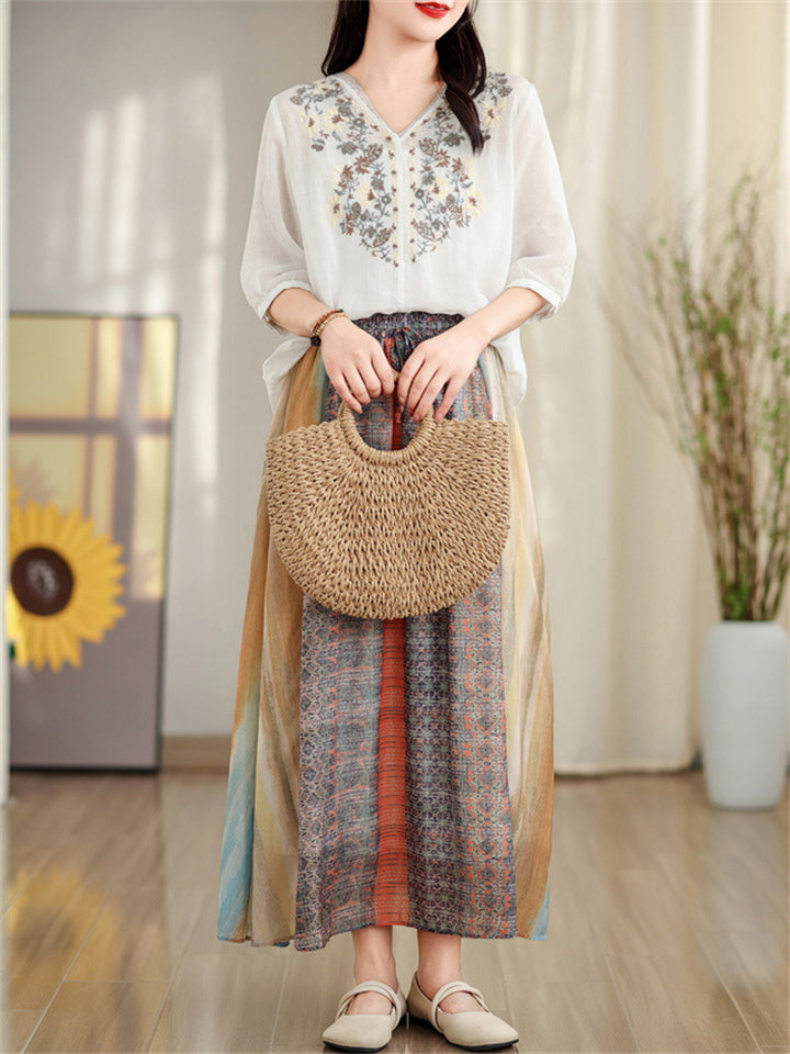 Retro Embroidery Mesh Elastic Waist Skirts for Women