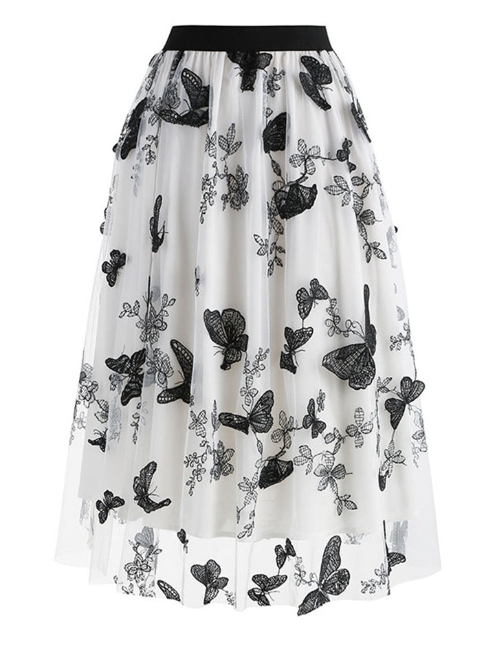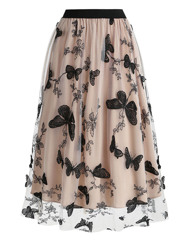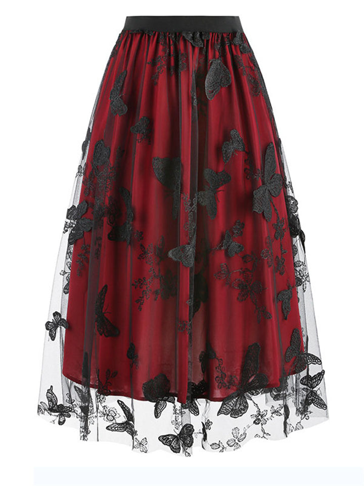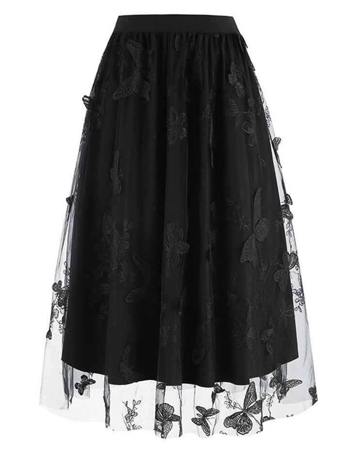 Retro Embroidery Mesh Elastic Waist Skirts for Women