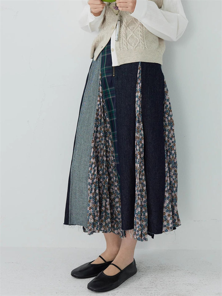 Japanese Style A-Line Patchwork Denim Skirts for Women