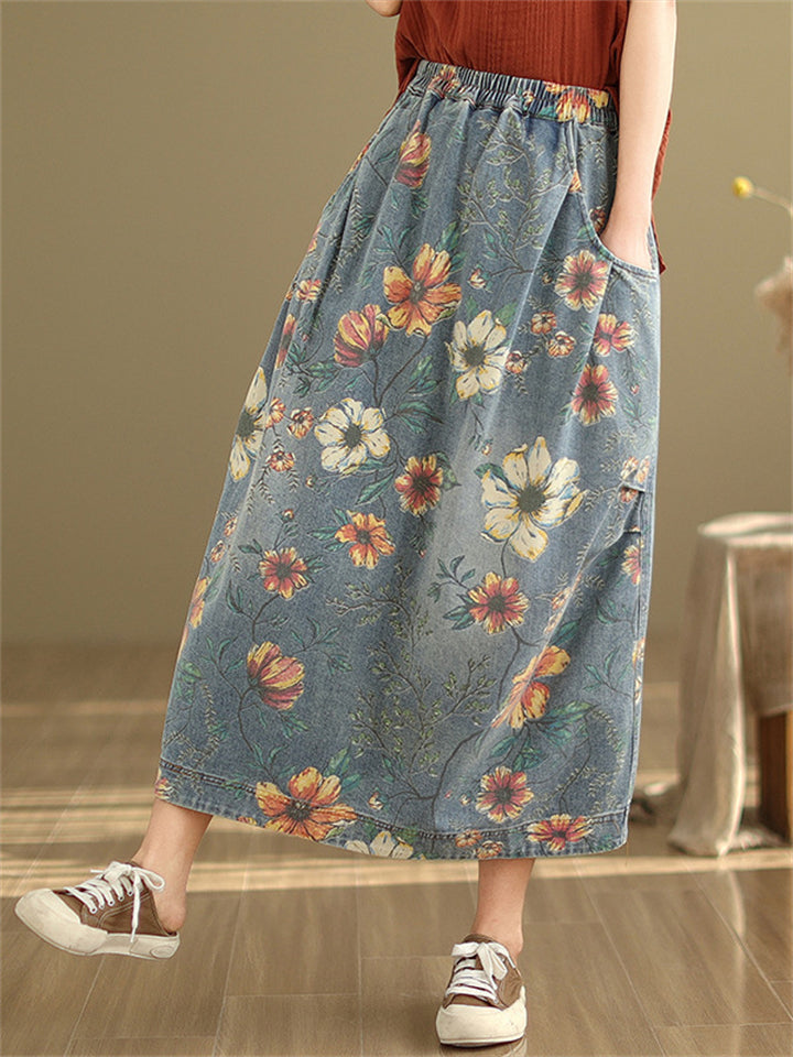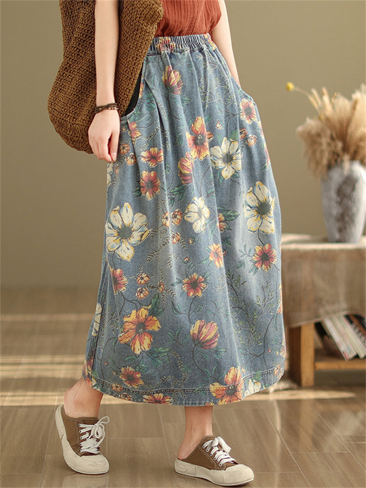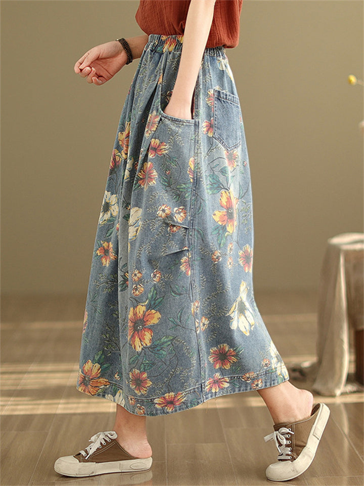Women's Vintage Floral Printed Pleated Elastic Waist Big Hem Skirts