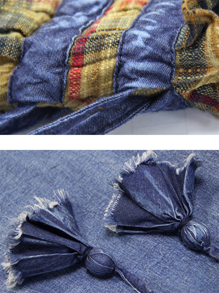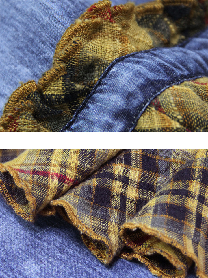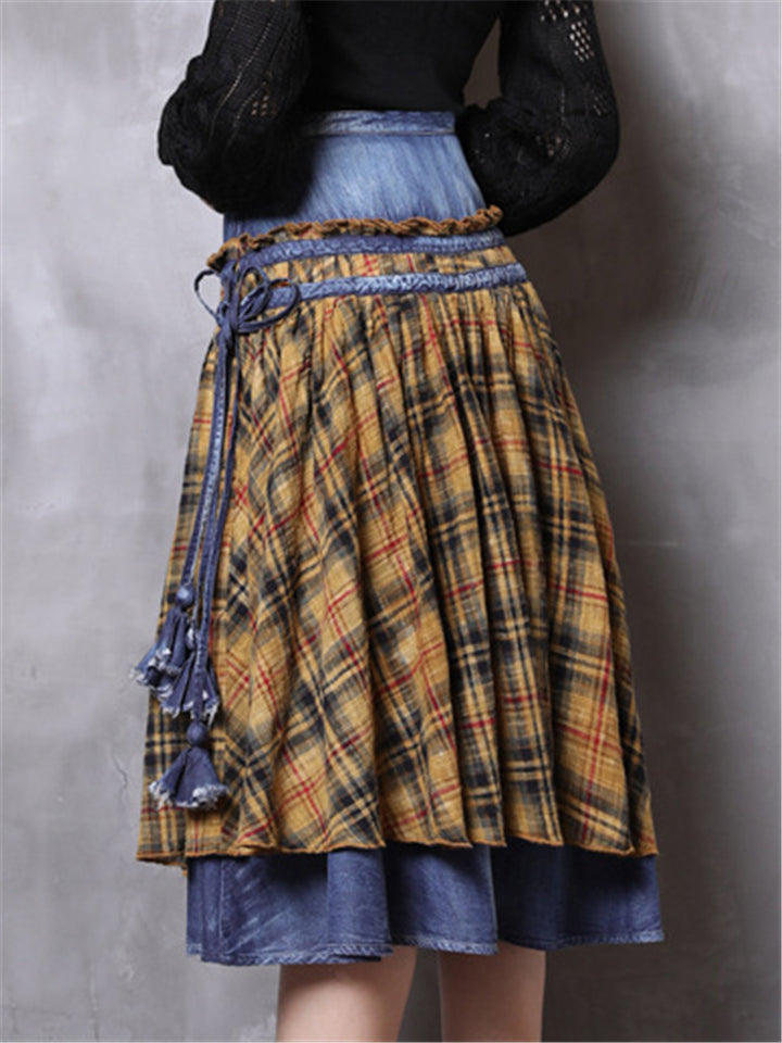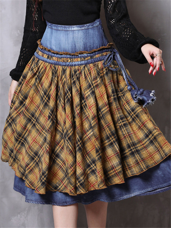 Patchwork Design Plaid Retro Denim Skirt
