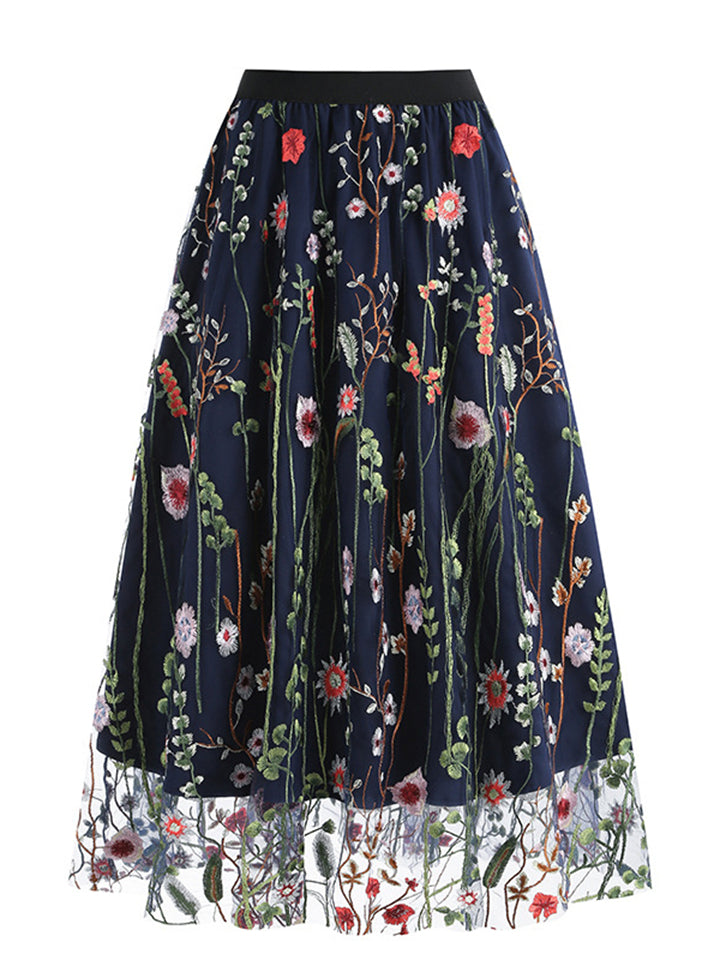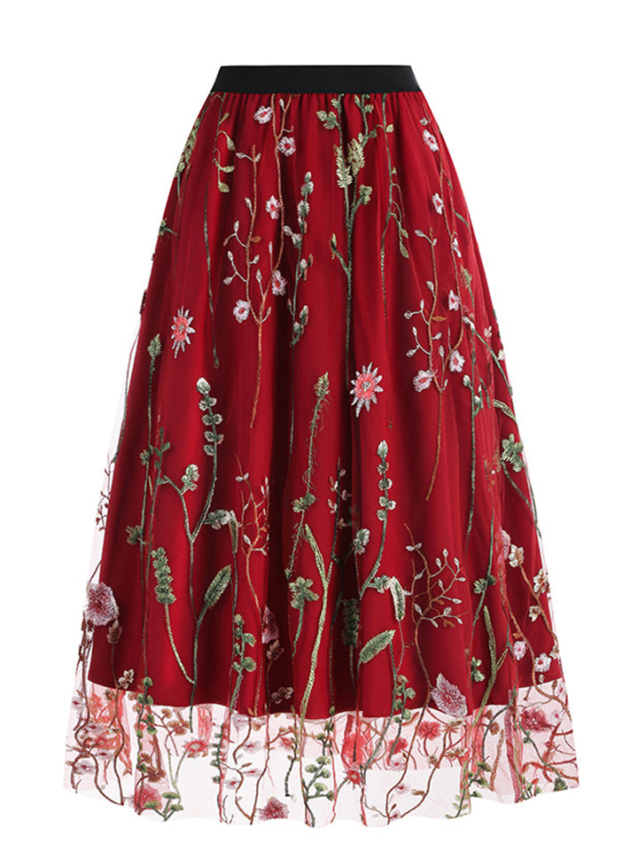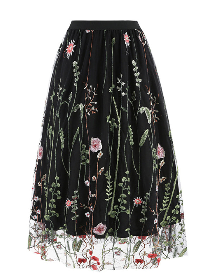 Retro Embroidery Mesh Elastic Waist Skirts for Women