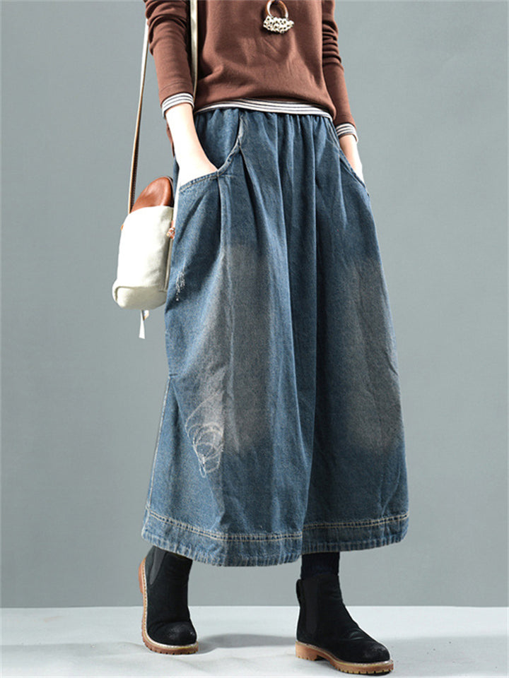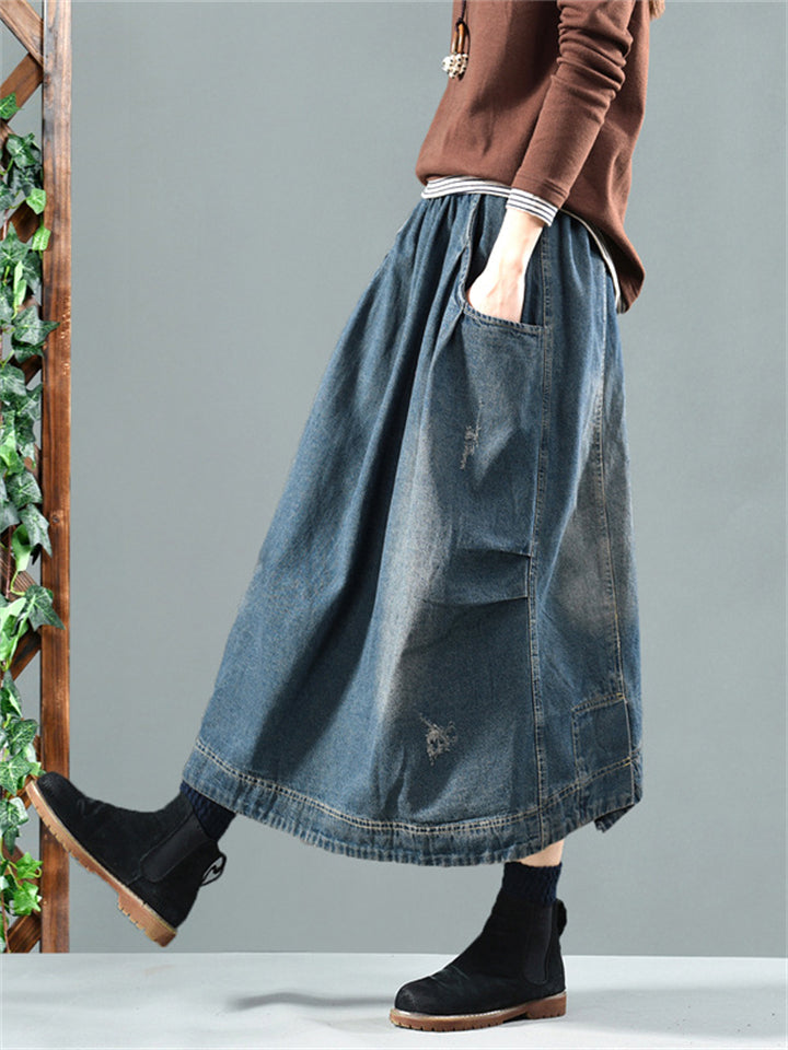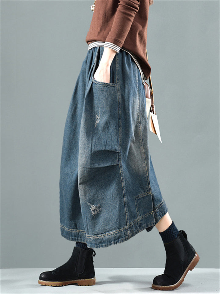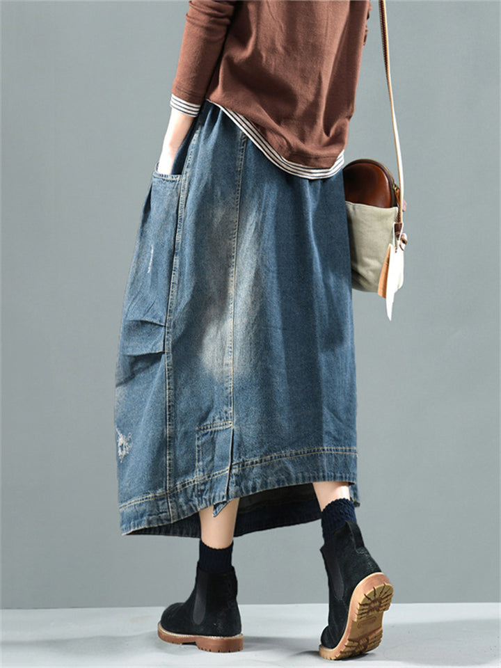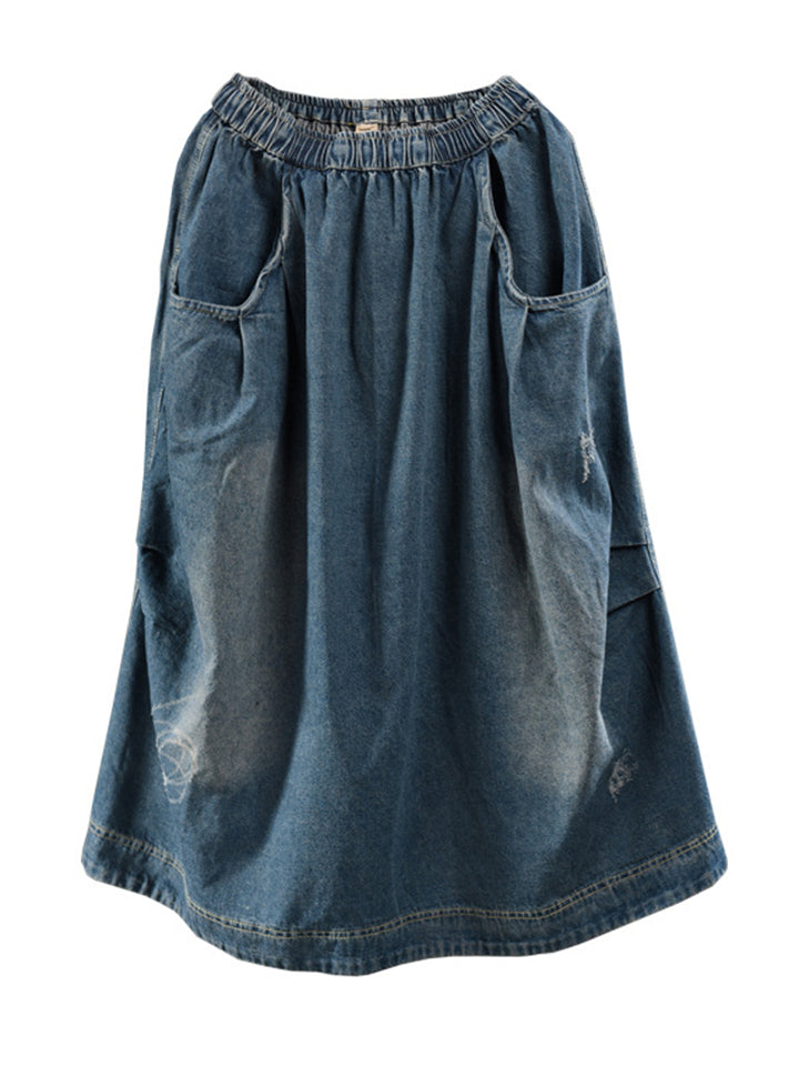 Retro Pocket Elastic Waist Blue Denim Skirt for Women