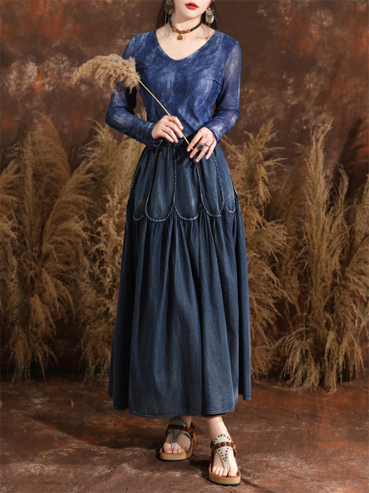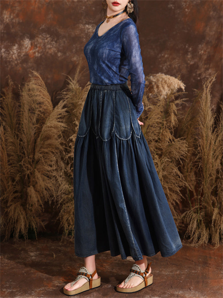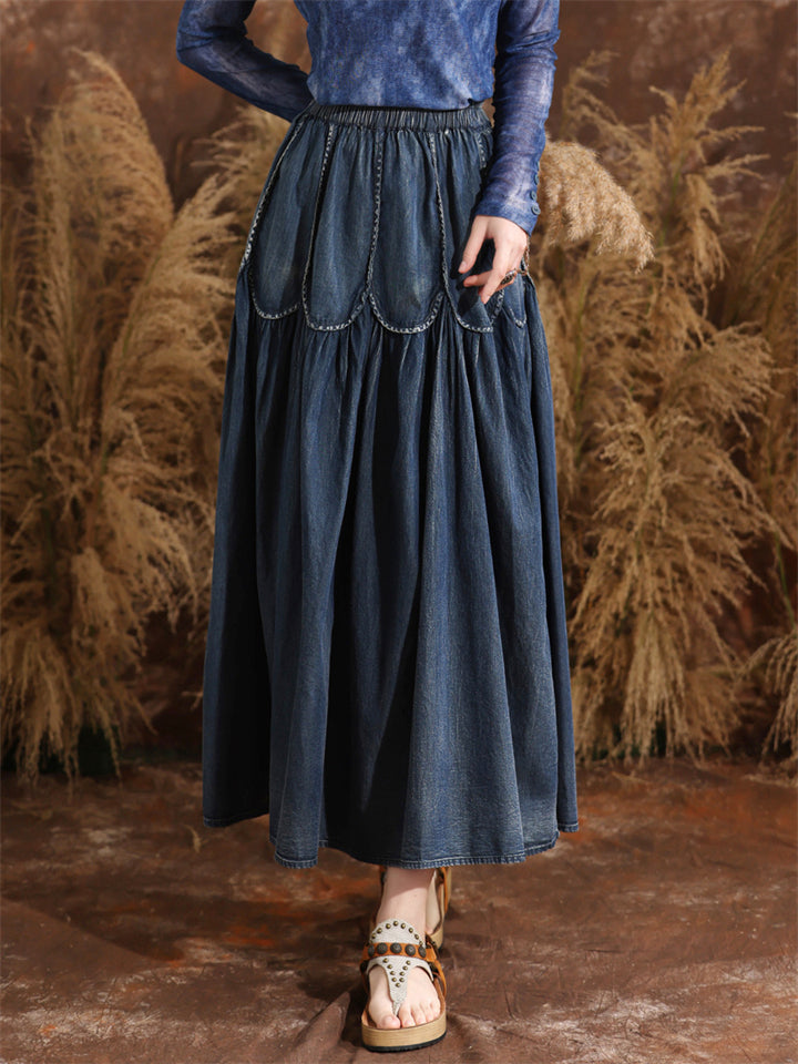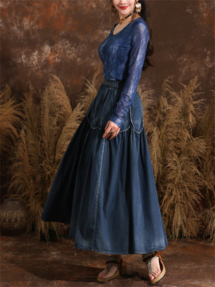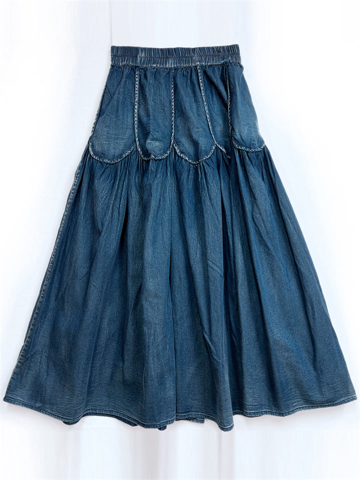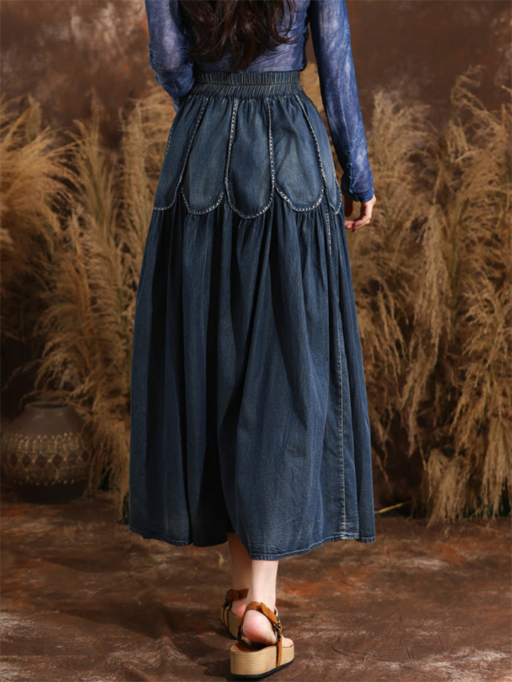 Women's Summer Vintage Style Splicing Elastic Waist Blue Denim Skirt