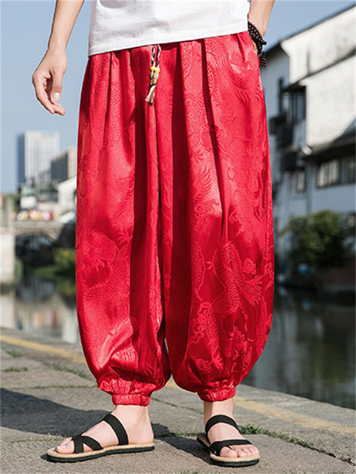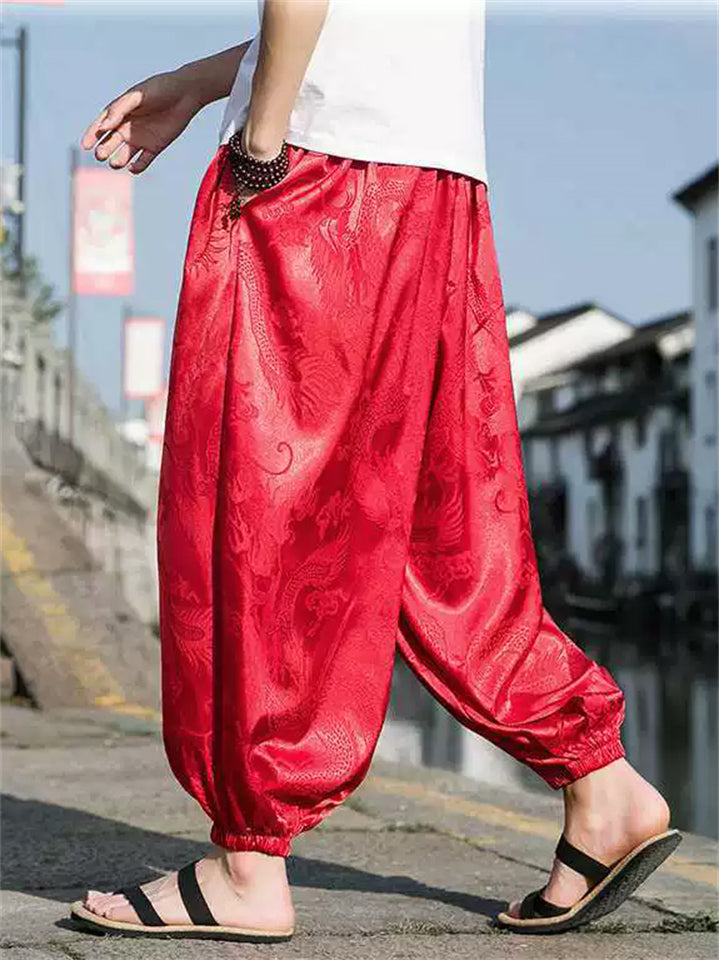 Men's Summer Cool Loose Fit Casual Carrot Pants with Chinese Style Dragon Print