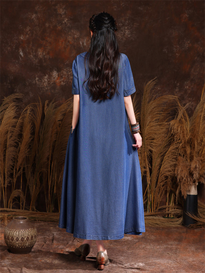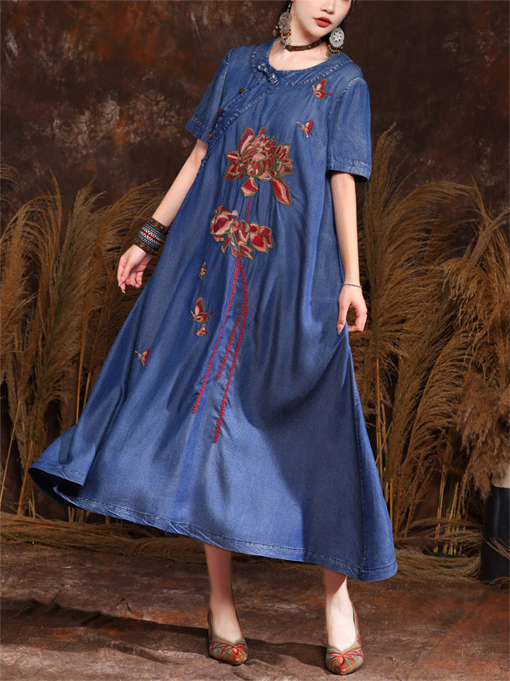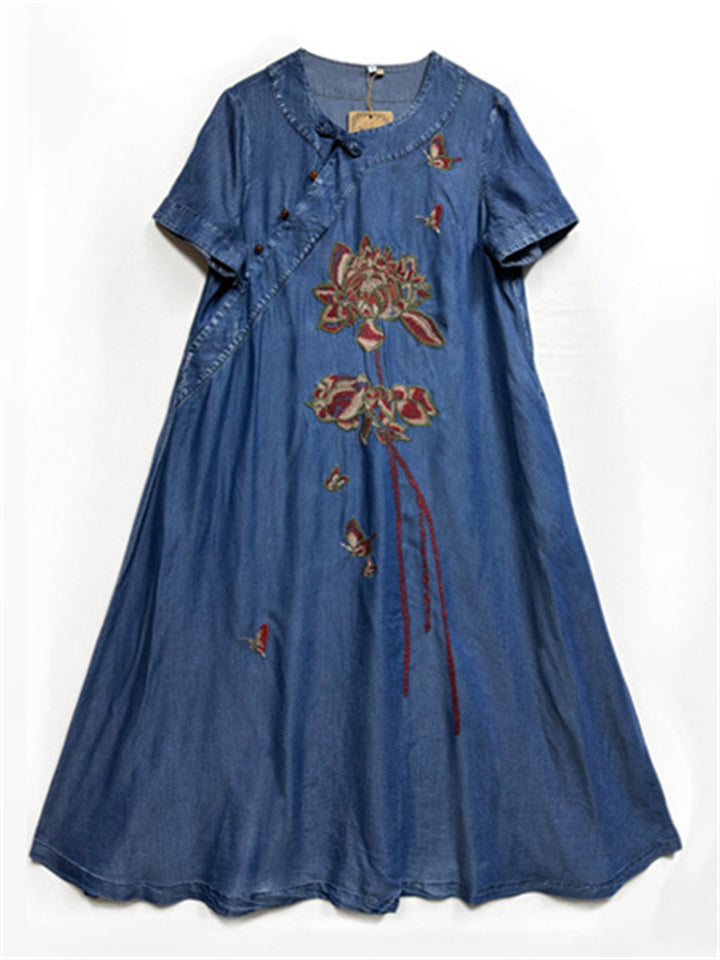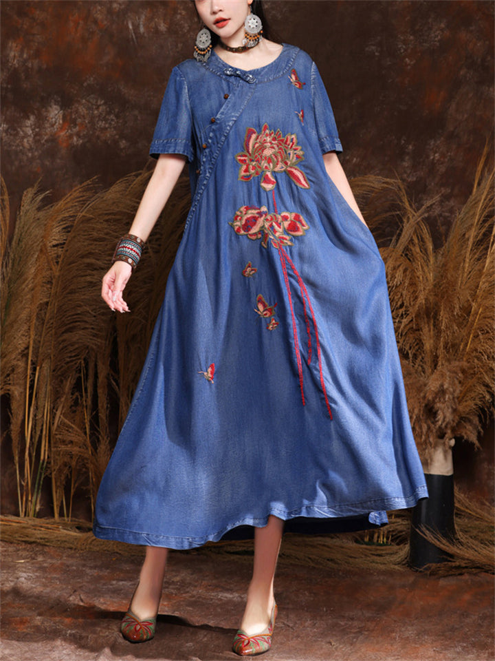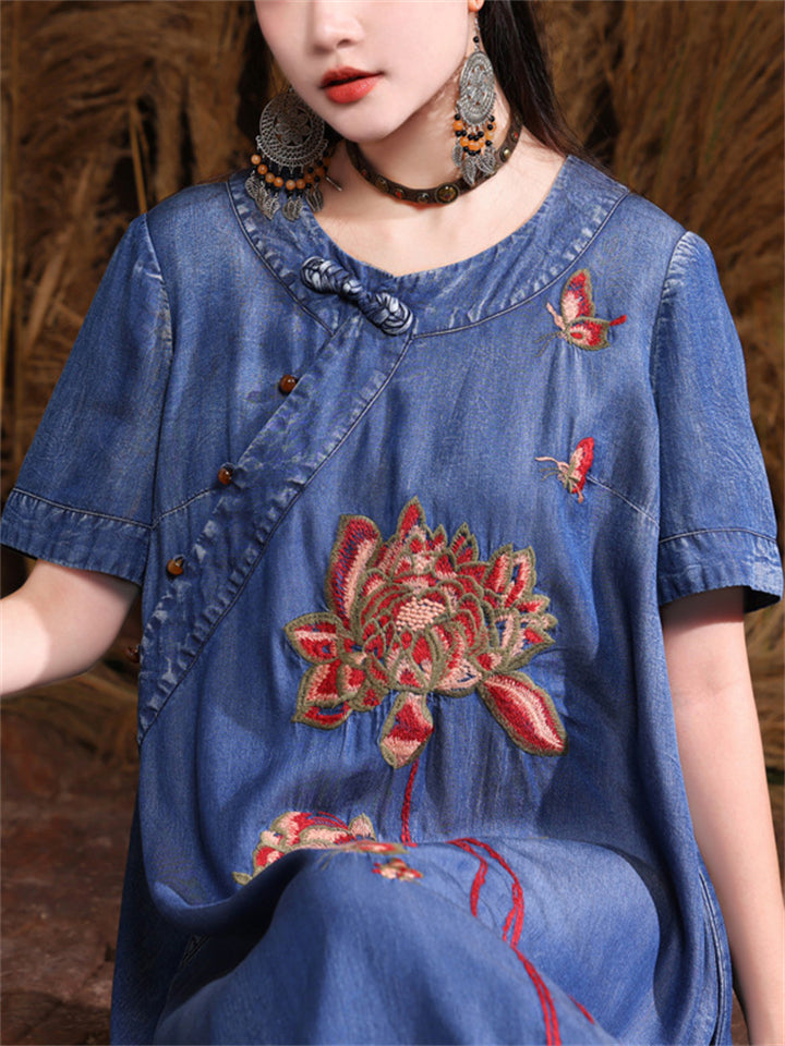 Ancient Style Red Lotus Embroidery Short Sleeve Dress for Women