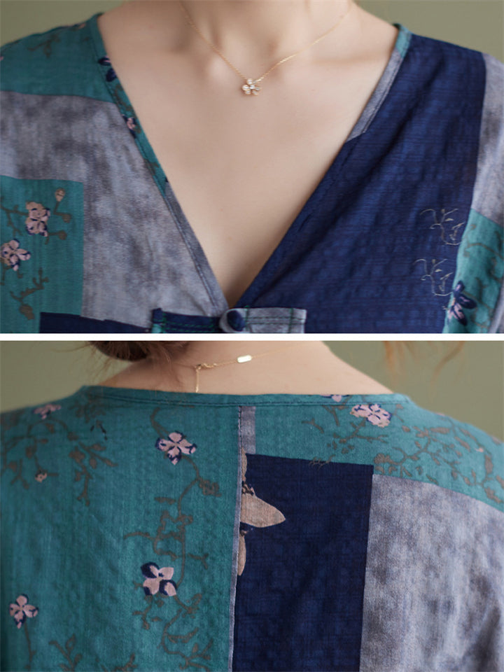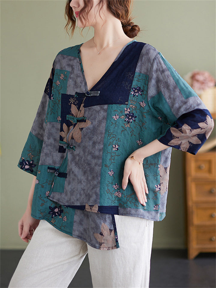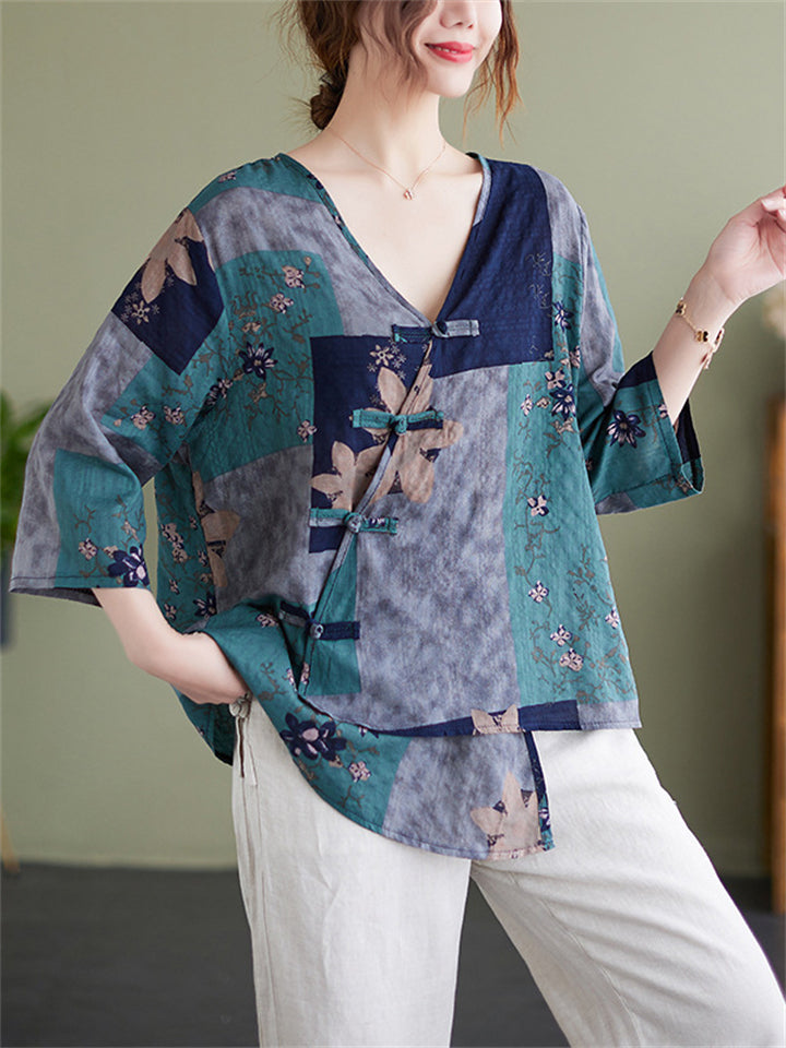 Summer Bohemian Style V Neck Print Vacation Shirt for Women