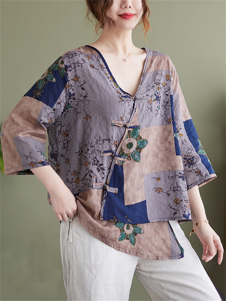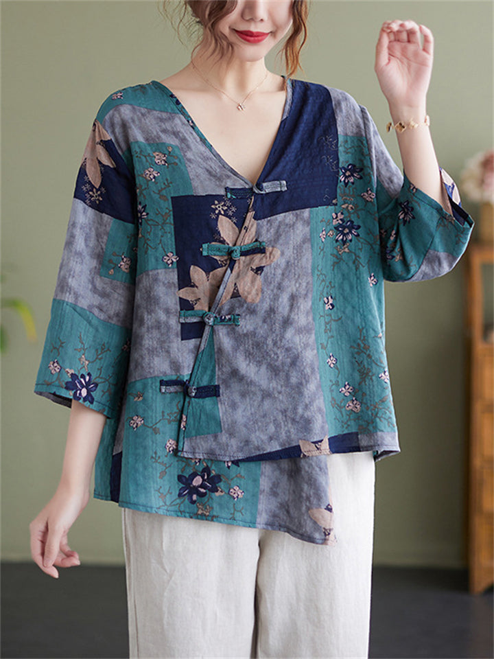 Retro Floral Printed V-Neck Pullover T-Shirts