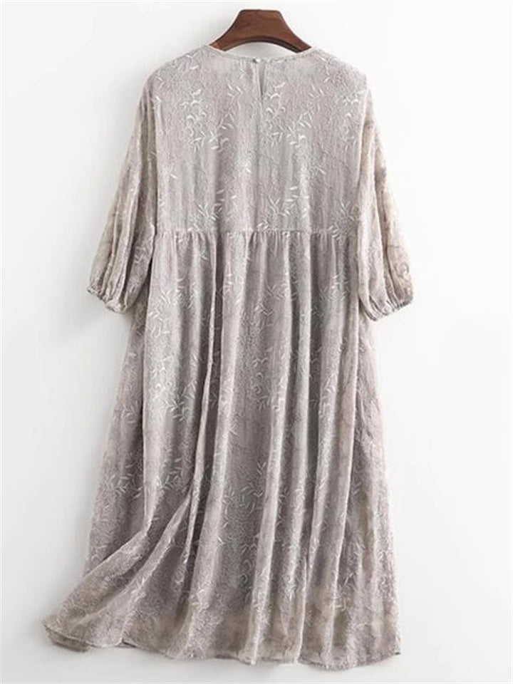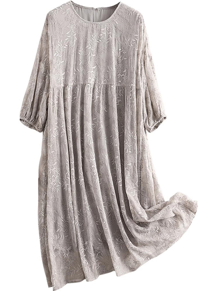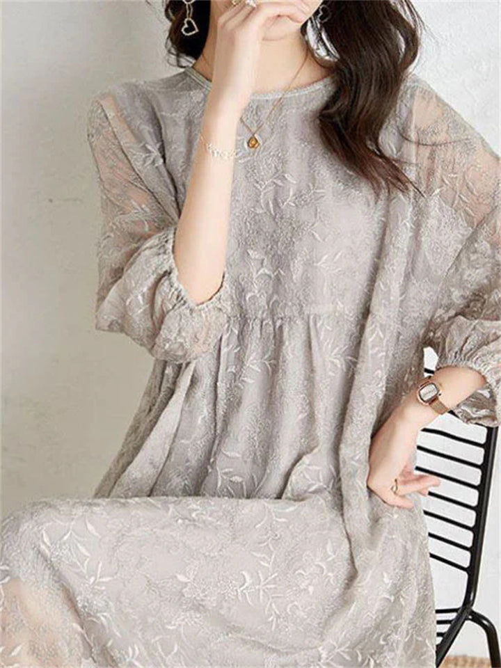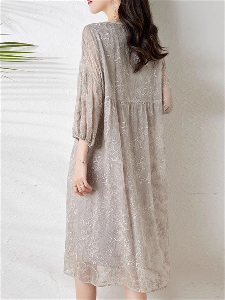 Beautiful Lace Floral Embroidery Silky Midi Dress for Lady