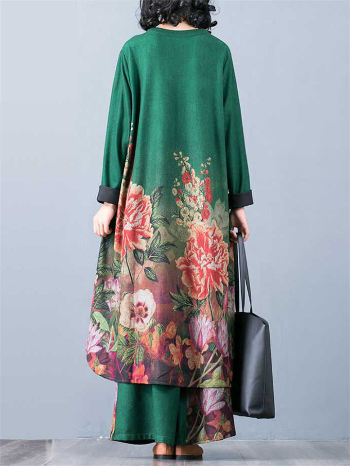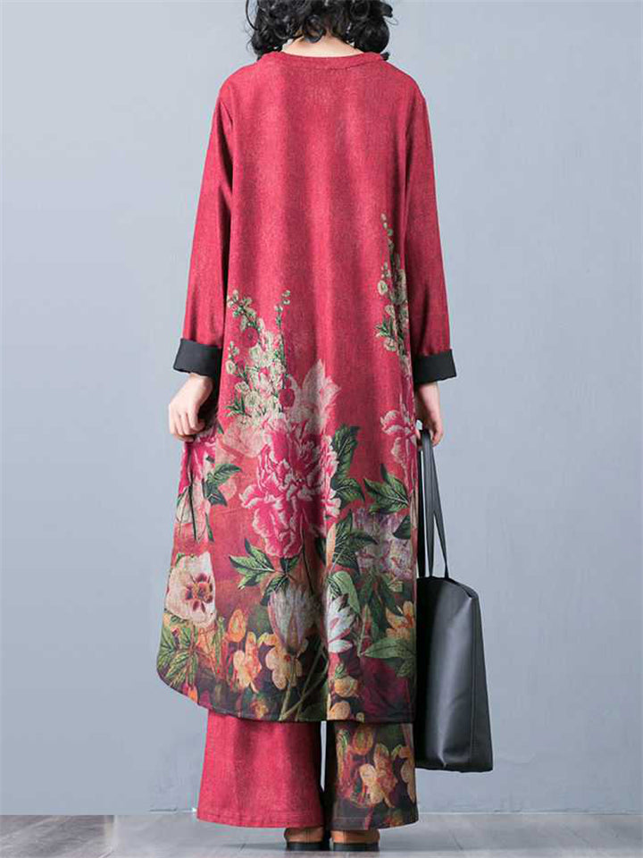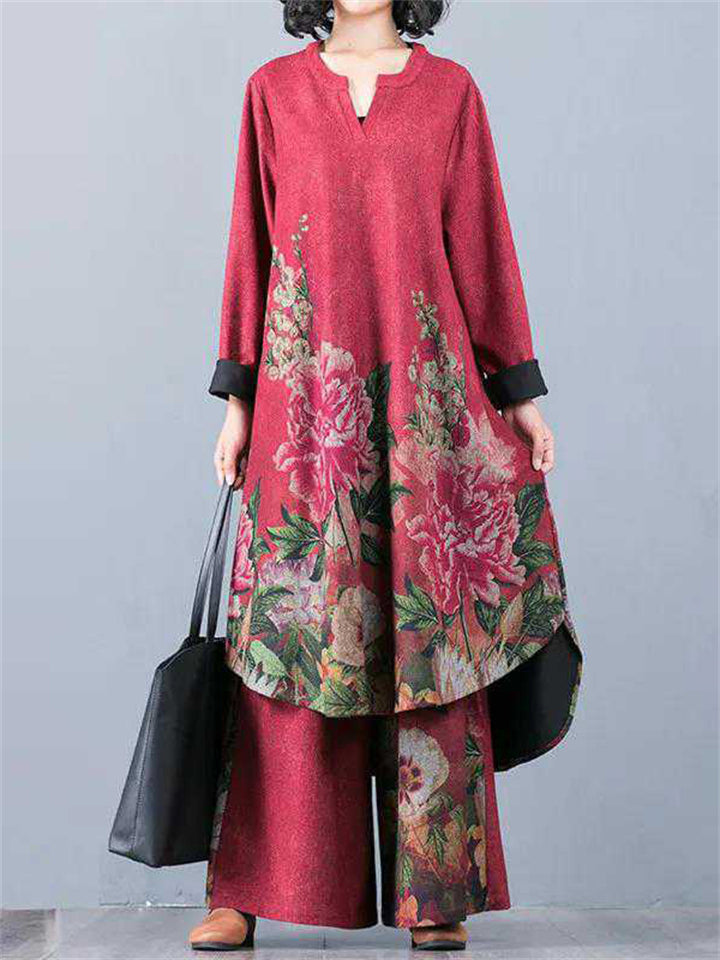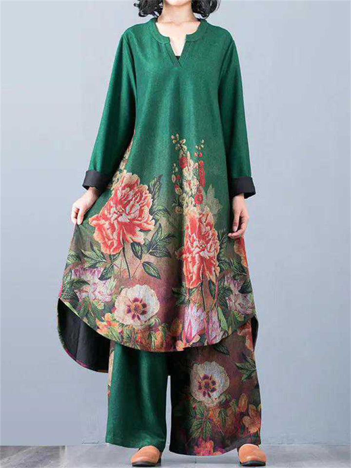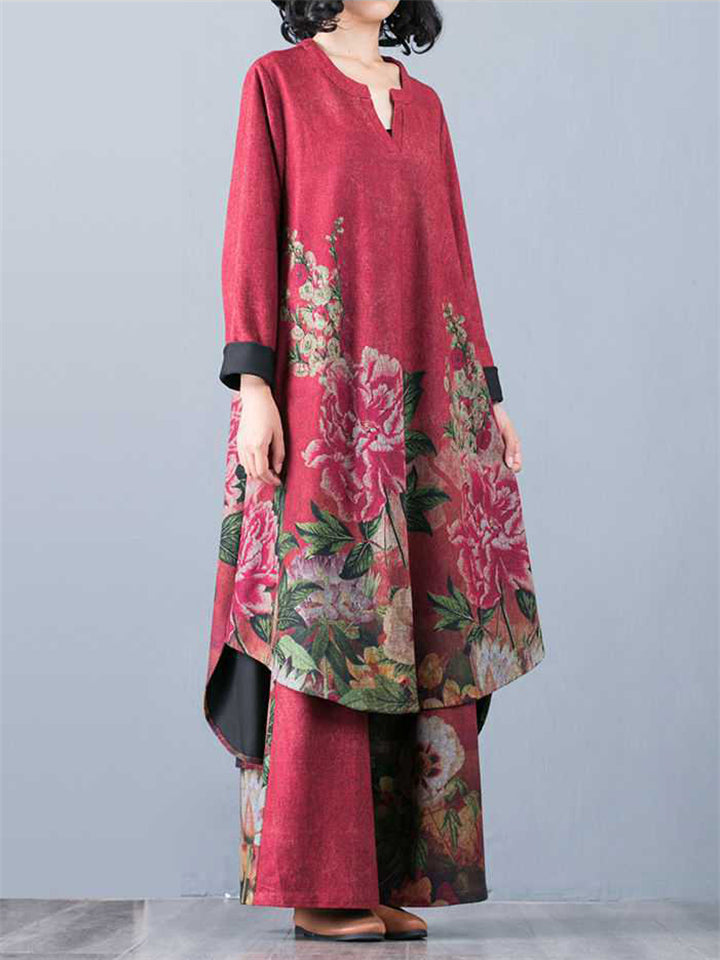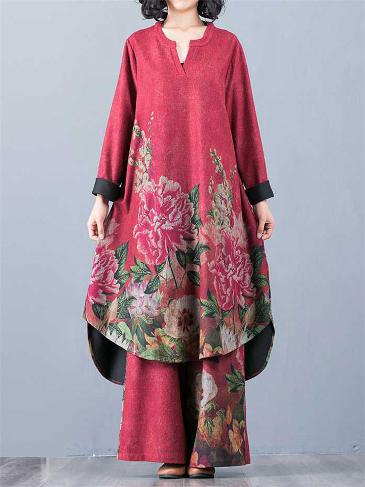 Beautiful Peony Print V Neck Long Sleeve Shirt + Loose Pants