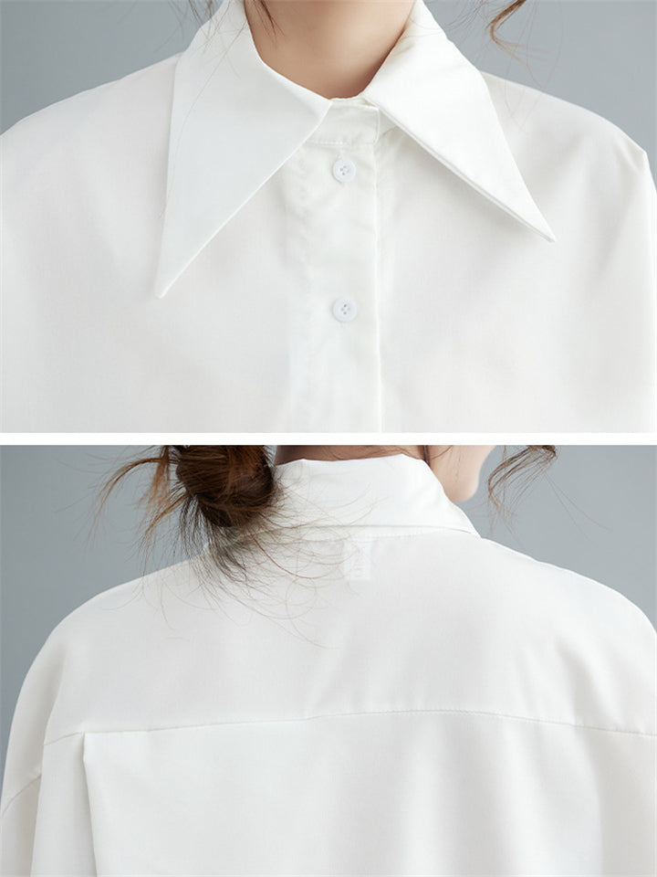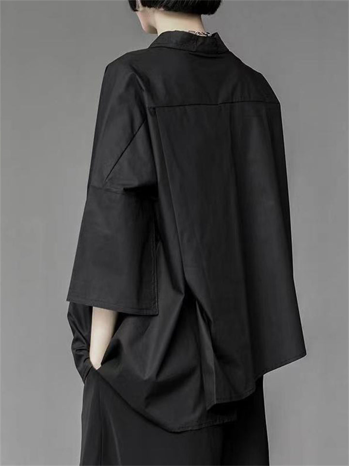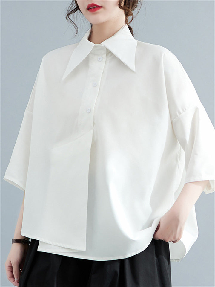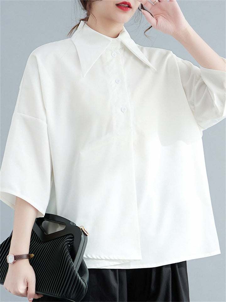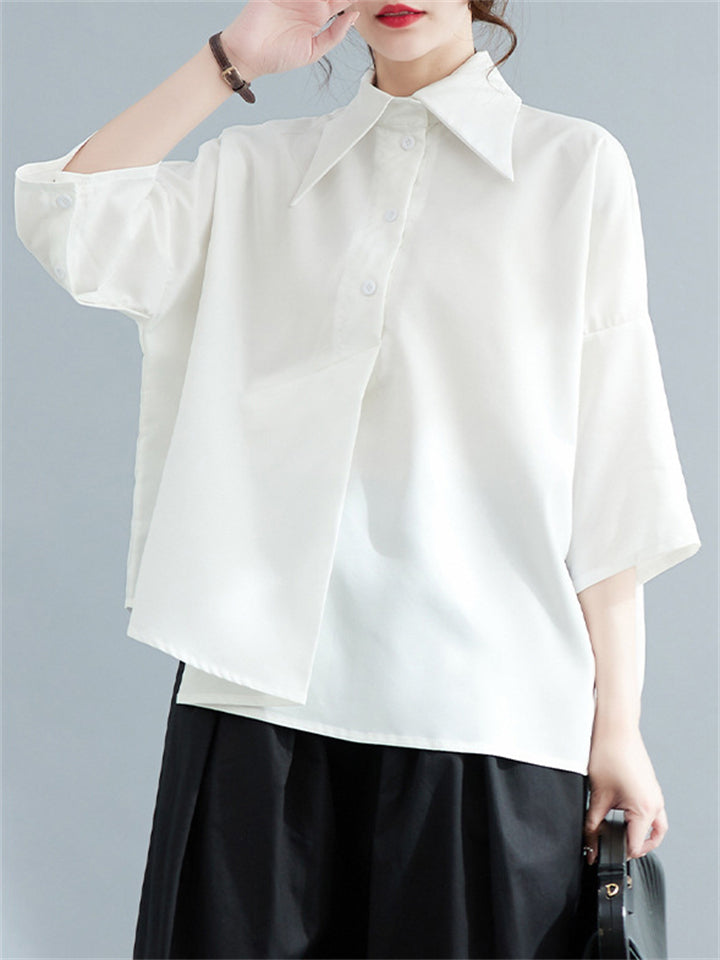 Black & White Simple Lapel Button Up 3/4 Sleeve Shirt for Women