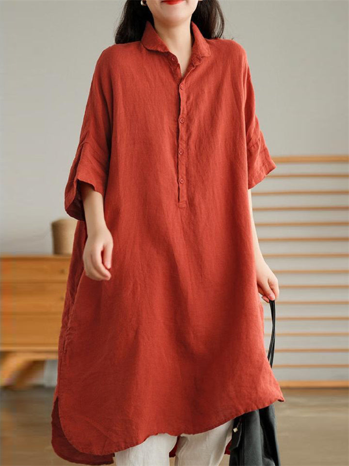 Ladies Country Style Red Flower Print Oversized Linen Shirt