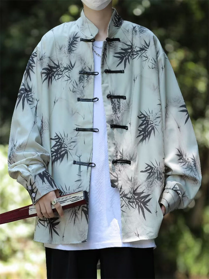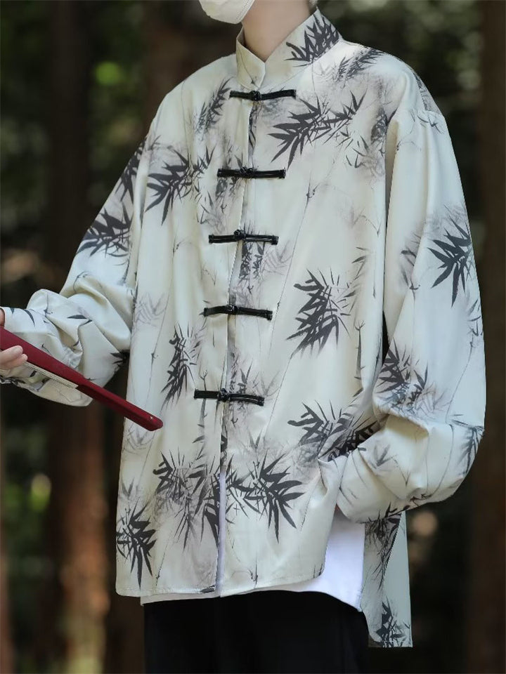 Chinese Stand Collar Button Ink Bamboo Shirt for Men