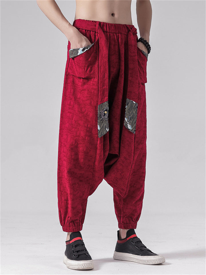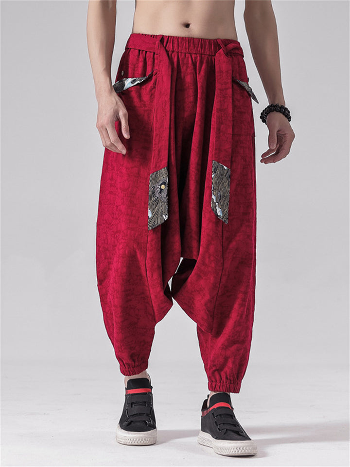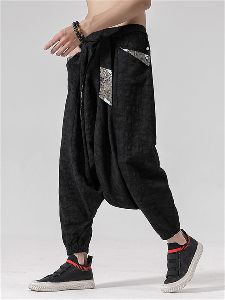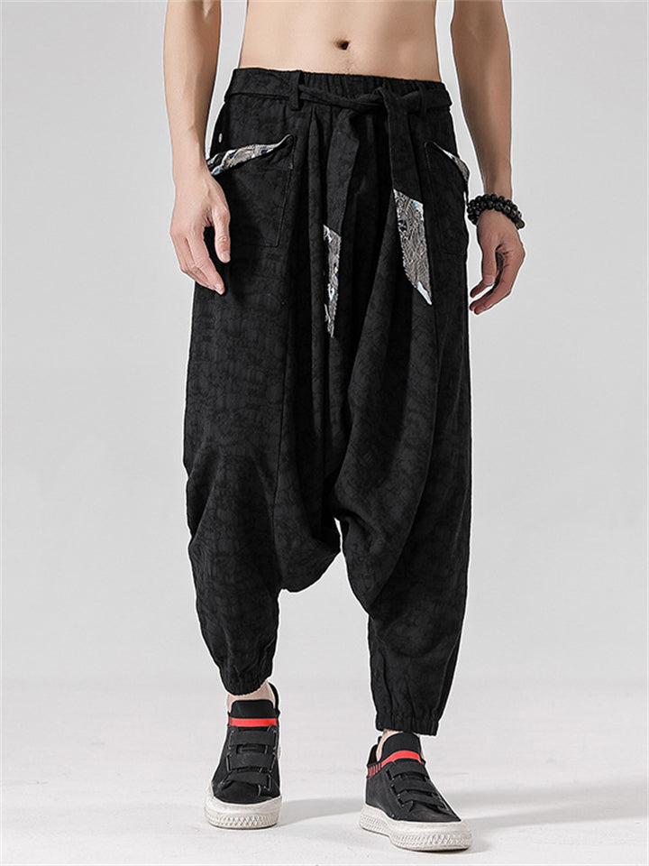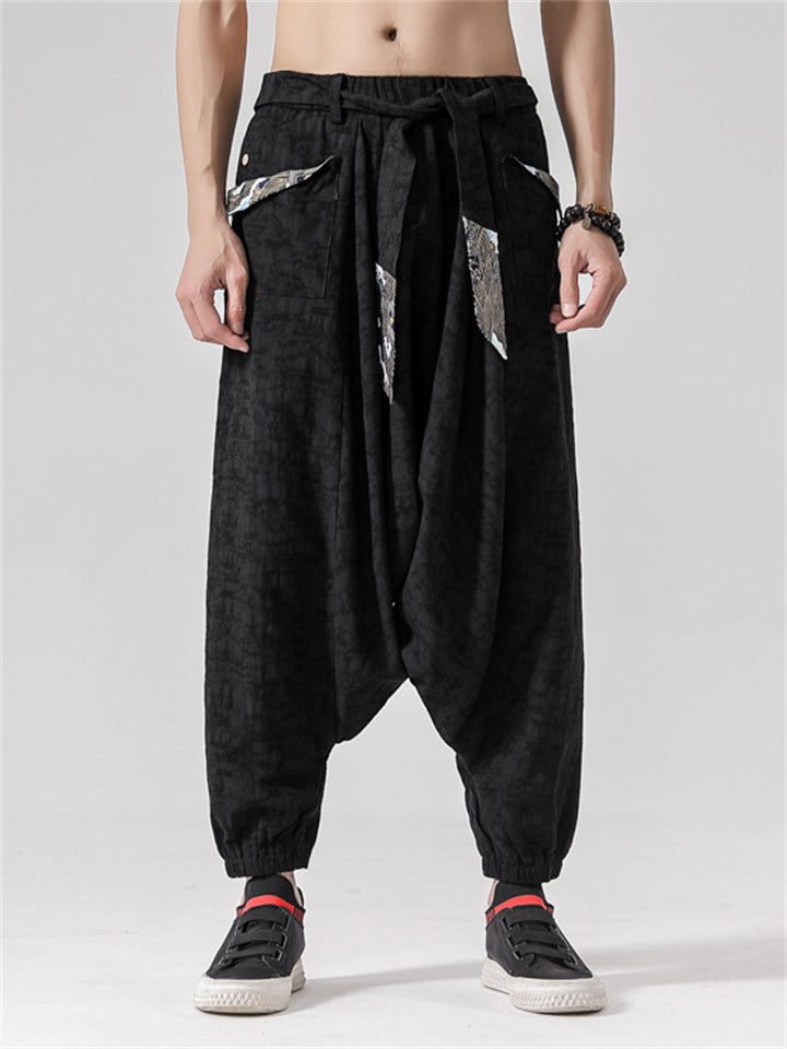 Chinese Style Men's Patchwork Harem Pants with Decorative Belt