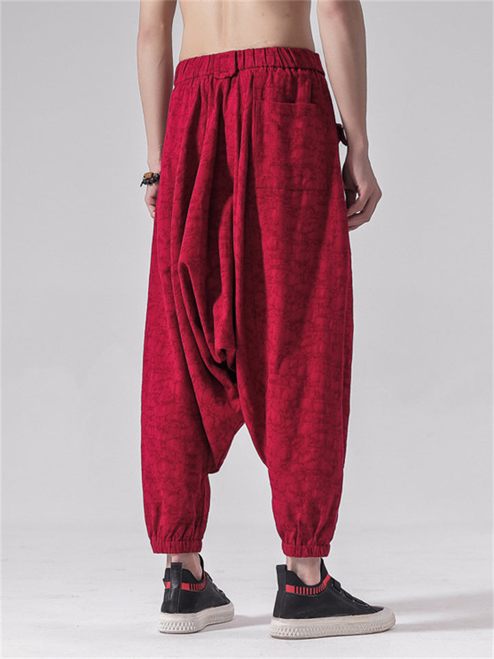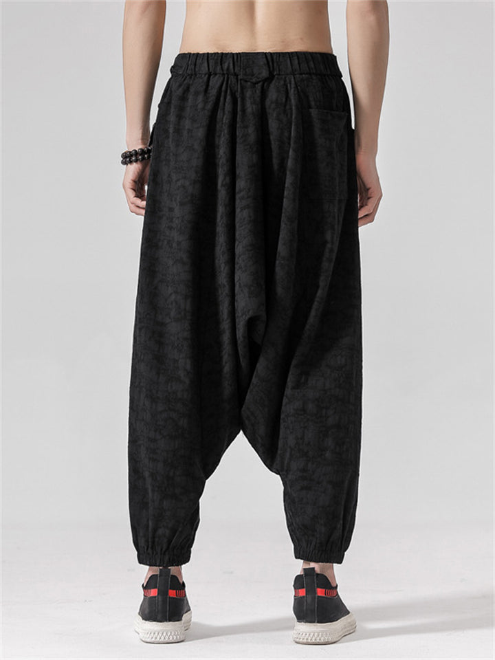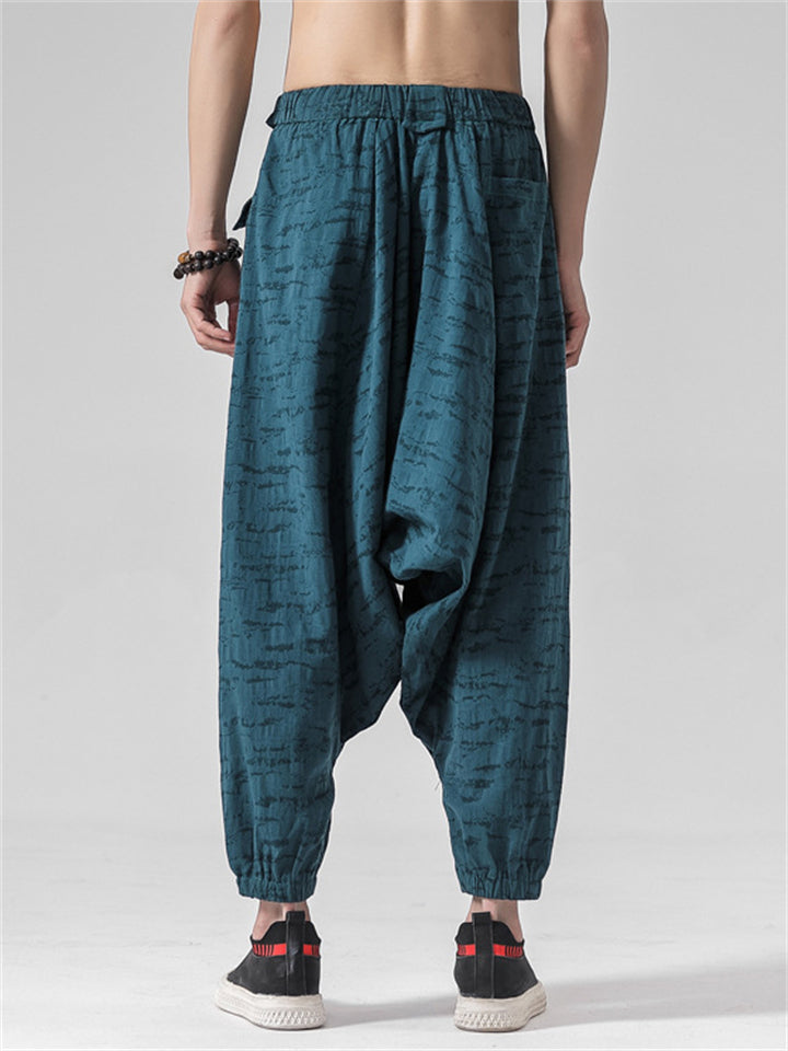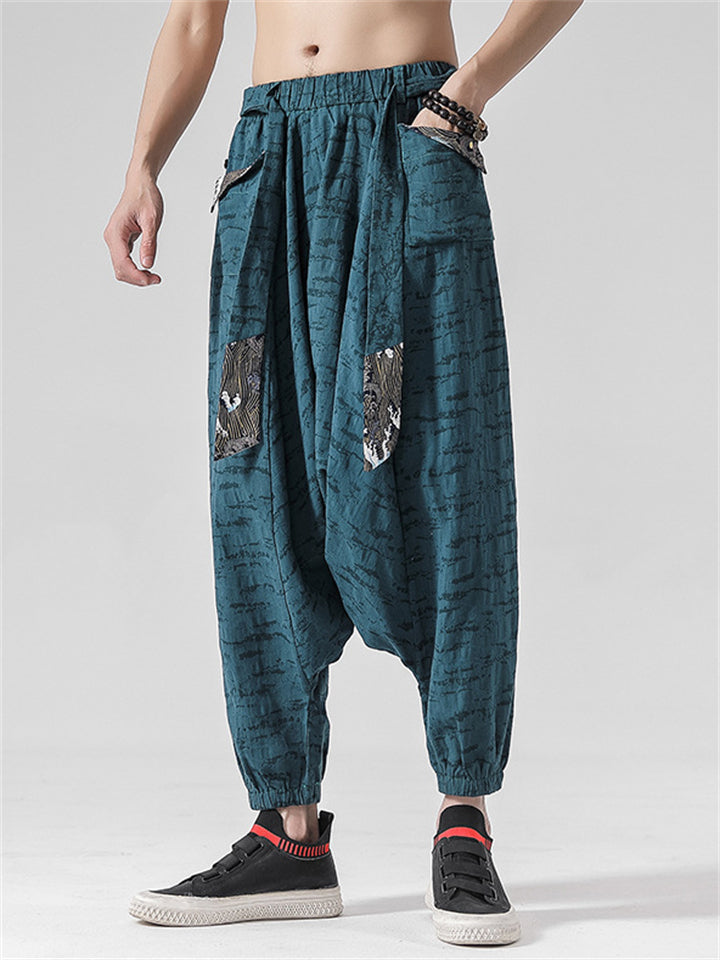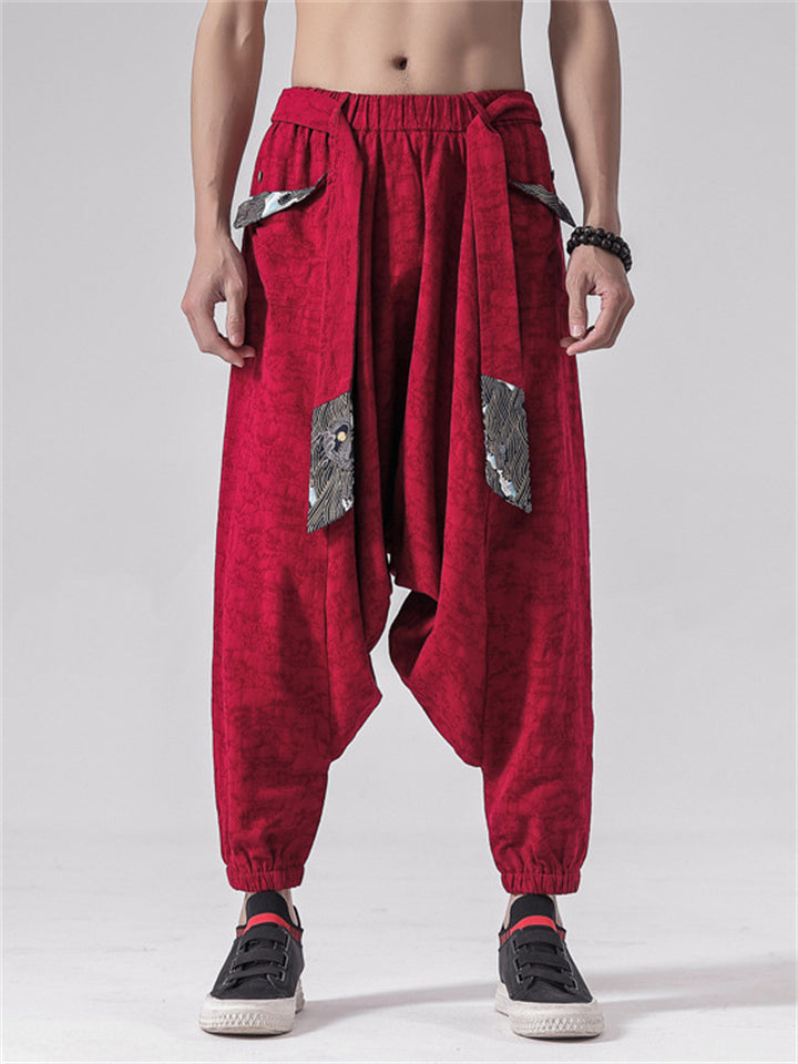 Chinese Style Men's Patchwork Harem Pants with Decorative Belt