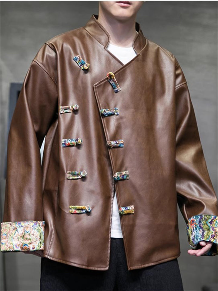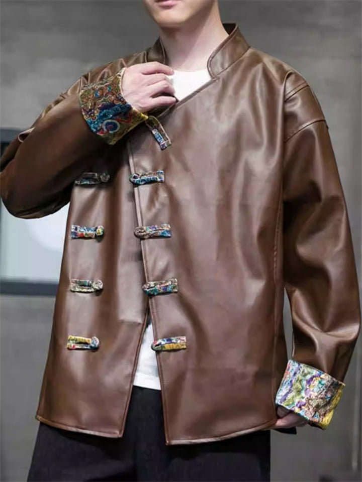 Chinese Style Patchwork Slant Placket PU Tang Suit Jacket for Men
