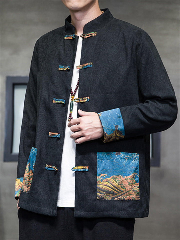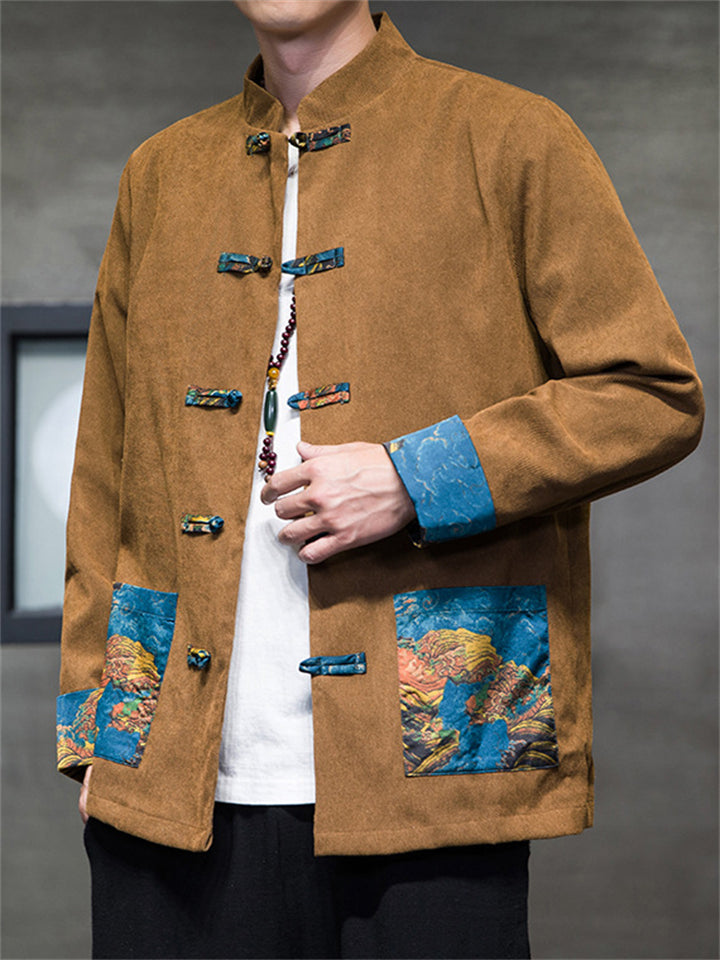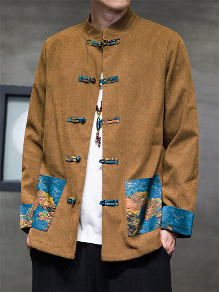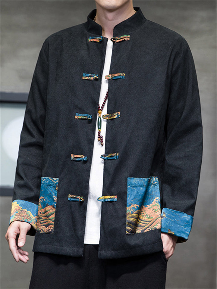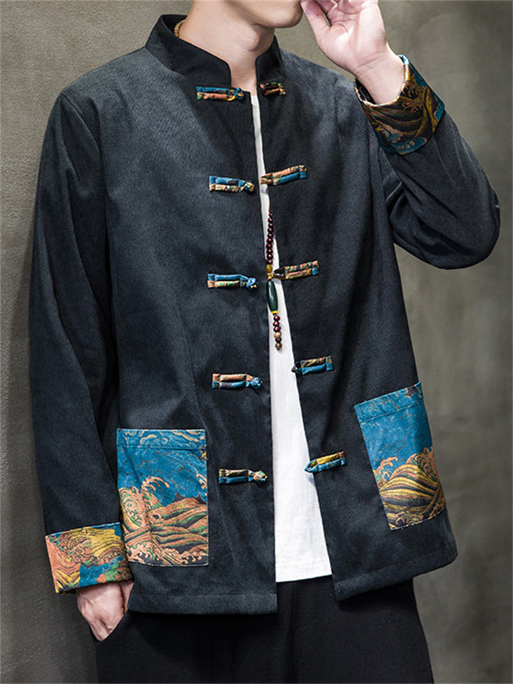 Contrast Color Print Pocket Knot Button Men's Tang Suit Jacket