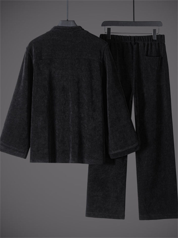 Men's 2Pcs Autumn Cotton Blend Corduroy Frog Button TangSuit Outfit